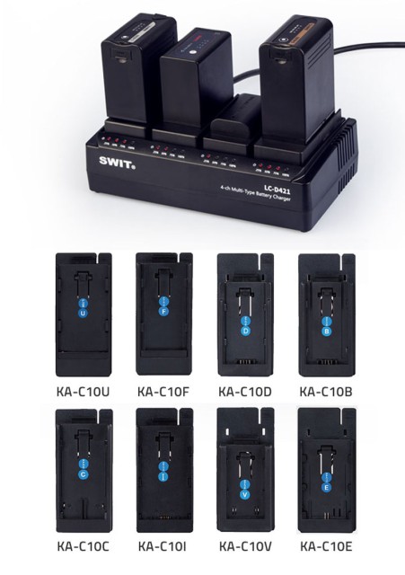 mit optionalen Batterieplatten. Das Ladegerät LC-D421 umfasst das Ladegerät selbst (ohne Platten), zu dem Sie bis zu 4 verschiedene Akkuplatten für Sony-, Panasonic-, JVC- oder Canon-Kameras auswählen können. Eine praktische Lösung, wenn Sie mehrere verschiedene Batterien und Geräte haben - ein Ladegerät für fast alle Batterien und Geräte.Für das 4-Kanal-Ladegerät sind die folgenden Batterieplatten erhältlich"