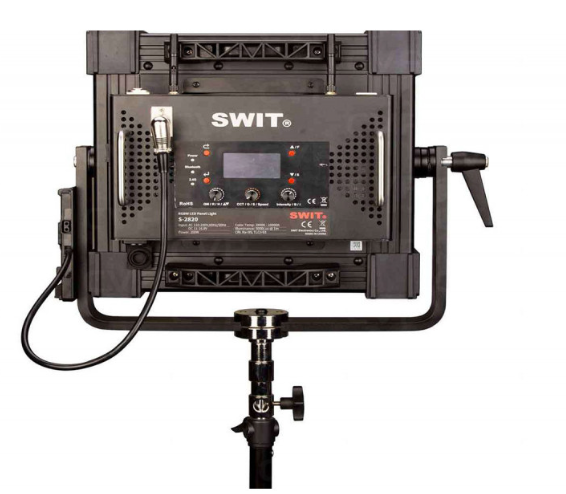 Die Steuerungsoptionen sind umfassend und umfassen ein integriertes Bedienfeld auf der Rückseite, eine 8-Kanal-DMX-Steuerung und die Bedienung über eine Smartphone-App (iOS und Android). Das Gerät unterstützt Wechselstrom über einen SpeakOn-Eingang und Gleichstrom (14,8–26 V) über einen 4-poligen XLR-Anschluss und wird mit einer V-Mount-Batterieplatte geliefert. Für den mobilen Betrieb wird die Verwendung kompatibler SWIT-Hochleistungsakkus wie S-8183S, PB-R290S, PB-H290S oder PB-H260S empfohlen.