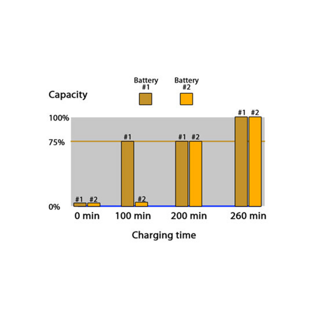 und kann 2 Akkus nacheinander auf 75% Kapazität aufladen, und dann