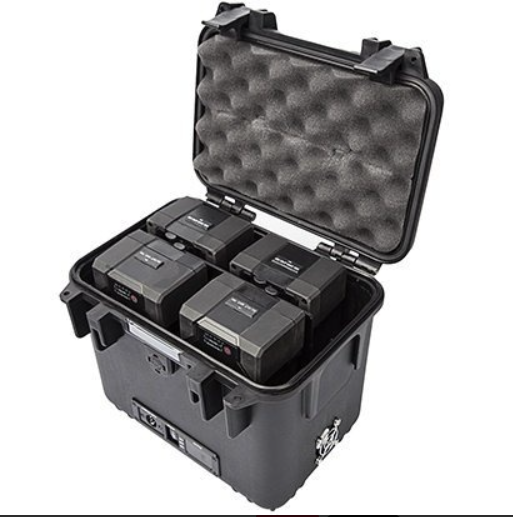 Das System unterstützt das Laden der Batterien direkt im Gehäuse mit dem mitgelieferten 5-A-Ladegerät, sodass die Batterien zum Laden nicht entfernt werden müssen. Dieses integrierte Design gewährleistet längere Laufzeiten und eine zuverlässige Stromversorgung für Kinokameras, Beleuchtungsgeräte und andere Geräte mit hohem Energiebedarf und ist damit eine unverzichtbare Stromversorgungslösung für professionelle Videoproduktionen.