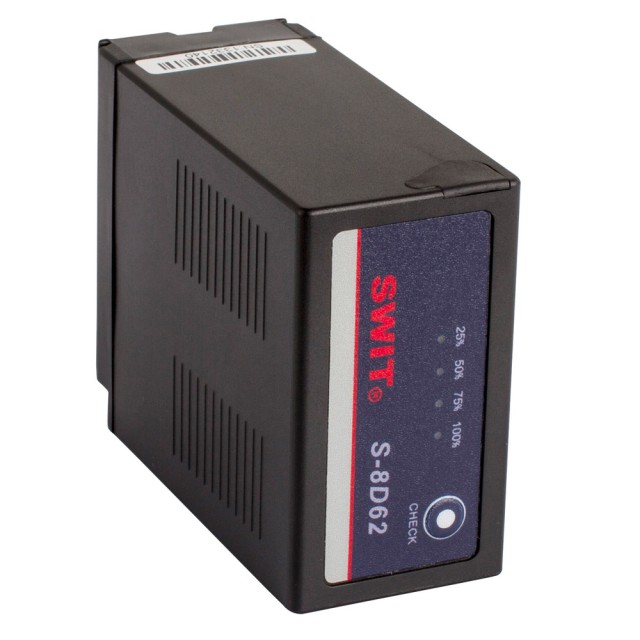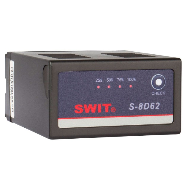 SWIT S-8D62 ist ein Panasonic CGA-kompatibler, wiederaufladbarer Li-Ion-Akku (7,2 V) mit 47 Wh und 6,6 Ah Kapazität, 4-LED-Statusanzeige, 7,2 V Gleichstromausgang und mehreren Schutzschaltungen.