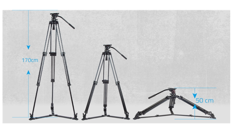 Mit einem 3-teiligen Beindesign, das mit einem einzigen Schnallenverschluss- und Verriegelungssystem von 50 cm bis 170 cm verstellbar ist, bietet das Stativ eine vielseitige Höhenverstellung für verschiedene Aufnahmewinkel. Der integrierte Fluidkopf sorgt für sanfte Schwenk- und Neigebewegungen mit einstellbarer Dämpfung für präzise Kamerabewegungen. Der Kopf ermöglicht eine 360°-Schwenkung und eine Neigung von -75° bis +90°, während eine leuchtende Wasserwaage eine genaue Ausrichtung gewährleistet.
