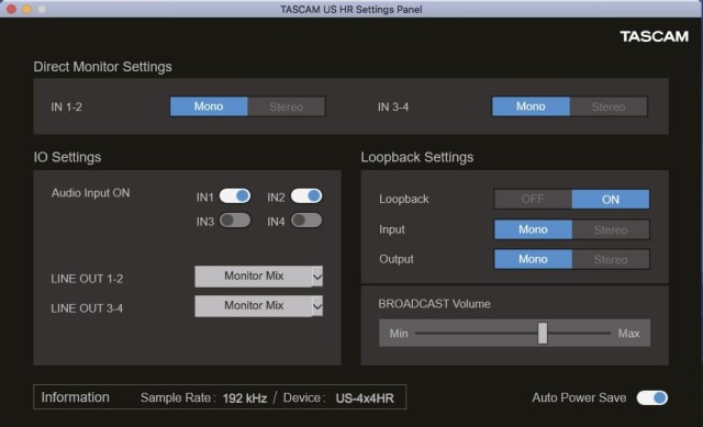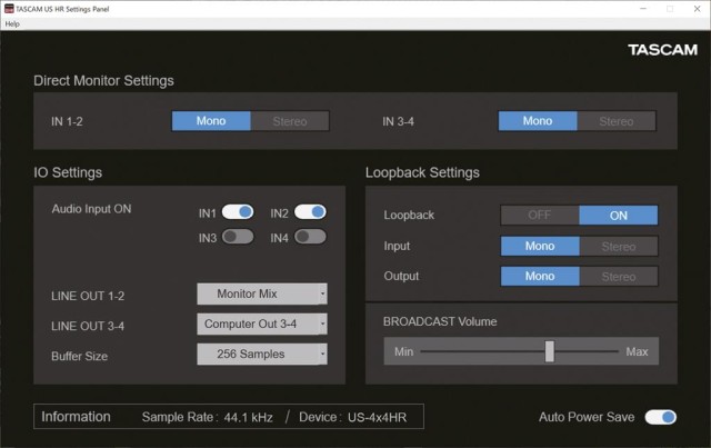 Für Online-Rundfunk, Internet-Kommunikation und andere Live-Streaming-Anwendungen bieten die Interfaces der US-HR-Serie eine Loopback-Funktion, mit der die Eingangssignale 1/2 mit den vom Computer kommenden Signalen 1/2 zusammengeführt werden können (beide können auf Mono oder Stereo eingestellt werden) und diese Mischung an die Rundfunk- oder andere Software auf dem Computer gesendet wird. Ein Software-Schieberegler ermöglicht die Einstellung der endgültigen "Broadcast"-Lautstärke unabhängig von der Einstellung des Line-Ausgangspegels des Geräts.