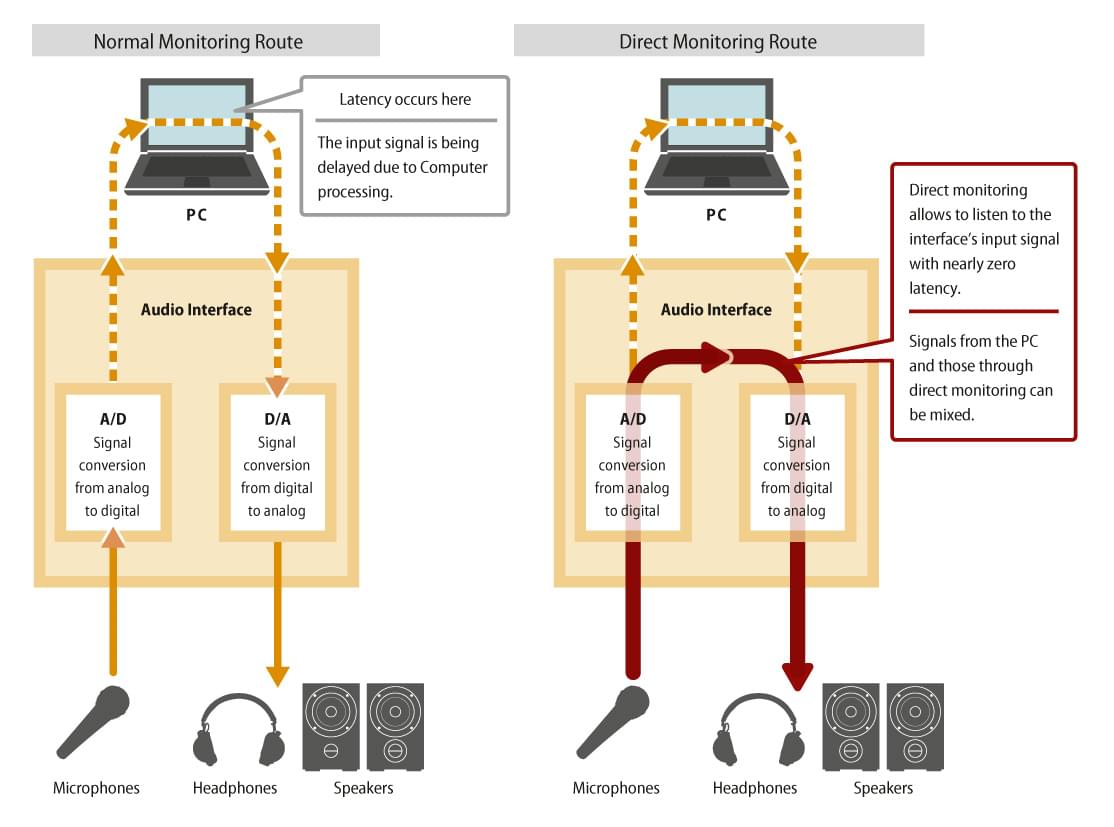 Bei der Audioaufnahme mit einem Computer werden die Eingangssignale in der Regel durch das Interface, den Computer und dann zurück zu den Ausgängen des Interfaces geleitet. Während die Signale die A/D- und D/A-Wandler in Ihrem Interface ohne merkliche Verzögerung passieren, kann die Audioverarbeitung durch den Computer zu einer deutlich hörbaren, störenden Zeitverzögerung führen. Dies hat zur Folge, dass Sie Ihre Stimme oder Ihr Instrument später hören als die auf dem Computer abgespielten Backing Tracks und Sie kaum in der Lage sind, synchron zum Wiedergabesignal zu spielen.