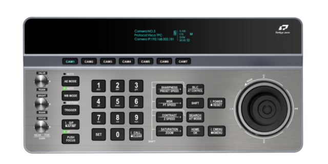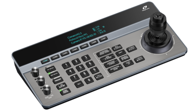 Ein integriertes 3,12-Zoll-OLED-Display liefert klare Echtzeit-Informationen zum Kamerastatus und zu den Steuerungseinstellungen. Das ergonomische Layout trennt numerische und funktionale Bedienelemente für eine intuitive Bedienung, während Tastenkombinationen einen schnellen Wechsel zwischen den Kameras ermöglichen. Zu den Anschlussmöglichkeiten gehören Ethernet mit PoE-Unterstützung sowie RS232-, RS422- und RS485-Schnittstellen, wodurch die Kompatibilität mit einer Vielzahl professioneller PTZ-Kameras gewährleistet ist.