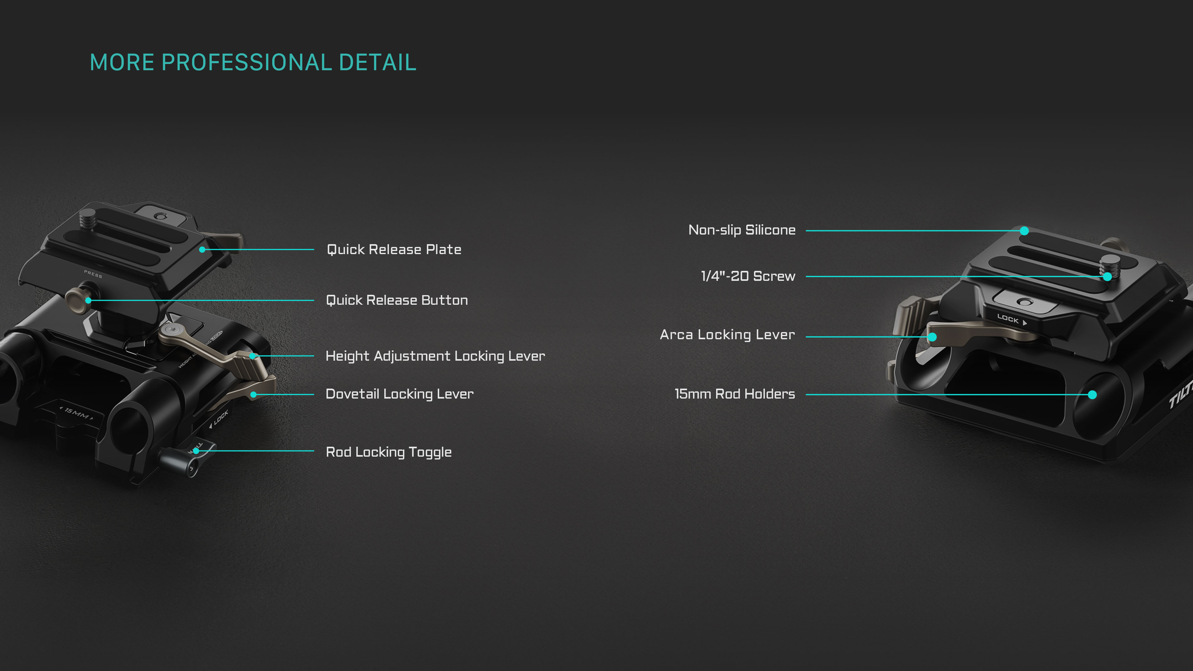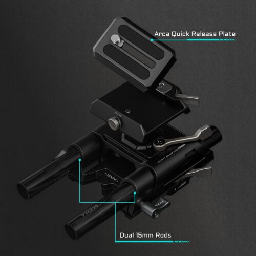 Die Unterseite der Grundplatte ist mit den Tilta Standard Dovetails kompatibel und verfügt außerdem über 1/4″-20 Gewinde zur Befestigung an Stativen und anderen Halterungssystemen.