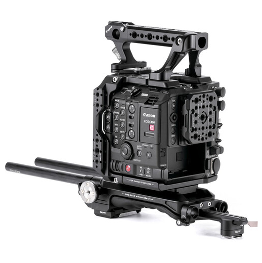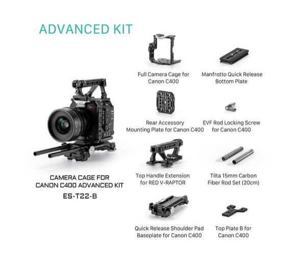 Der Tilta ES-T22-B Kamerakäfig für Canon C400 (Advanced Kit) bietet ein komplettes modulares Ökosystem, das für mehr Stabilität, erweiterte Befestigungsmöglichkeiten und reibungslose Übergänge zwischen Stativ-, Schulter- und Handaufnahmen entwickelt wurde. Der Cage umfasst eine obere, eine linke und eine rechte Seitenplatte, eine Manfrotto-Schnellwechselplatte, einen oberen Griff, 7,8-Zoll-15-mm-Stangen, eine multifunktionale Rückplatte und eine zusätzliche obere Platte B für mehr Zubehörkompatibilität. Die mitgelieferte EVF-Stangen-Feststellschraube gewährleistet die vollständige Kompatibilität mit dem elektronischen Sucher der Canon C400.