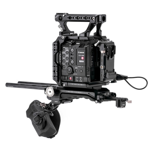 Das Pro Kit von Tilta verwandelt die Canon C400 in ein voll ausgestattetes Kino-Arbeitstier, ohne dabei ihre kompakten Vorteile zu beeinträchtigen. Der leichte Aluminiumkäfig besteht aus modularen Platten, die umfangreiche verdrehsichere 1/4"-20- und 3/8"-16-Gewinde, eine NATO-Schiene, ARRI-Rosetten und eine 15-mm-LWS-Halterung bieten. Die mitgelieferte V-Mount-Batterieplatte versorgt die Kamera und das Zubehör mit Strom, die Schnellwechsel-Schulterpolster-Grundplatte ermöglicht einen schnellen Wechsel von Handheld- zu Stativbetrieb (Manfrotto oben, VCT-U14 unten) und der obere Griff bietet zusätzliche Befestigungspunkte. Ein Verlängerungsarm auf der rechten Seite mit einem 50 cm langen USB-C-Kabel verlagert den Steuergriff der C400 für mehr Komfort beim Schultern, während zwei Carbonfaserstangen Matteboxen oder Follow-Focus-Systeme tragen. Perfekt für Dokumentar- und Spielfilmteams, die Geschwindigkeit, Ausgewogenheit und Erweiterbarkeit benötigen.