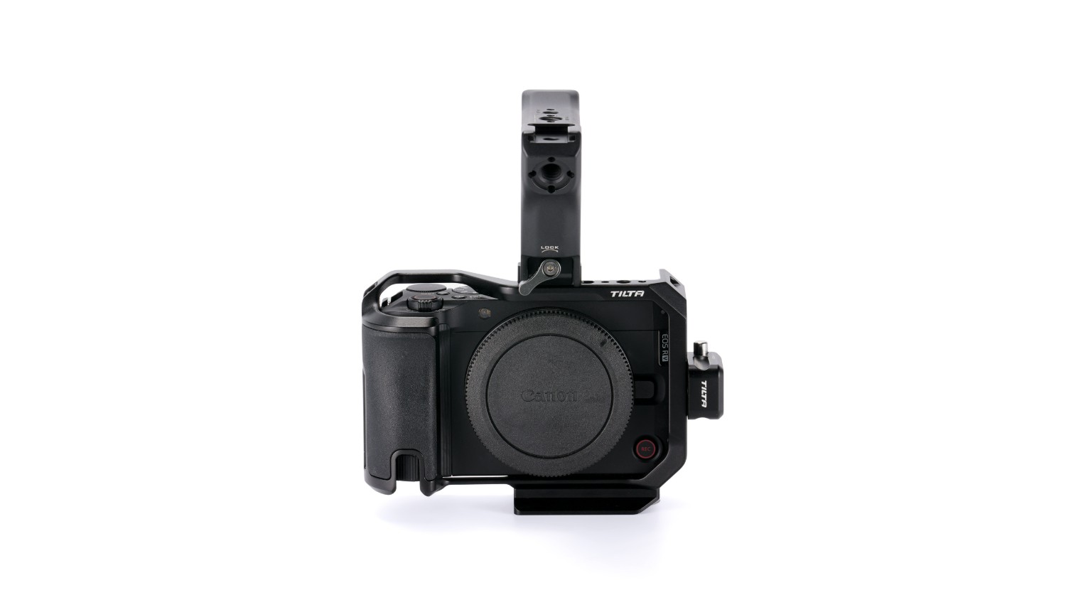 Grundausstattung für Canon R50 V. Dieser Käfig dient als Schutz für Ihr Kameragehäuse und ermöglicht gleichzeitig den Anschluss einer Vielzahl von externen Zubehörteilen über verschiedene Befestigungsmöglichkeiten, darunter eine Schiene, eine NATO-Schiene und 1/4"-20-Gewinde mit Fixierungspunkten (Locating Points).