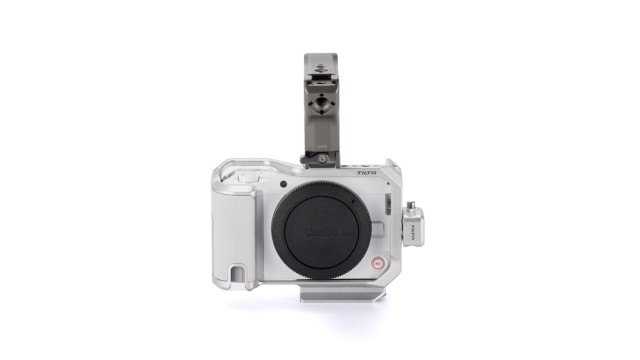 Grundausstattung für Canon R50 V. Dieser Käfig dient als Schutz für Ihr Kameragehäuse und ermöglicht gleichzeitig den Anschluss einer Vielzahl von externen Zubehörteilen über verschiedene Befestigungsmöglichkeiten, darunter eine Schiene, eine NATO-Schiene und 1/4"-20-Gewinde mit Fixierungspunkten (Locating Points).