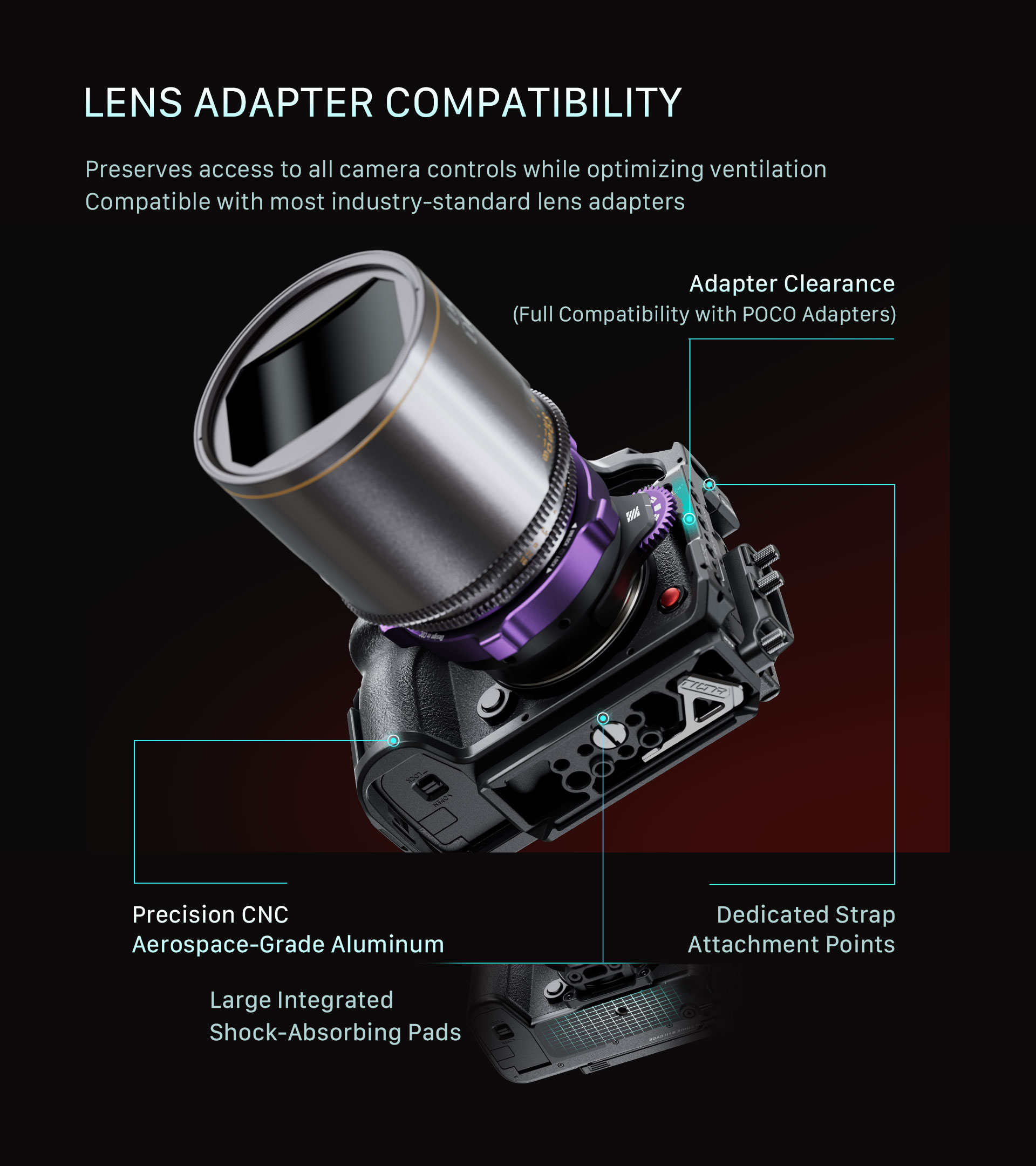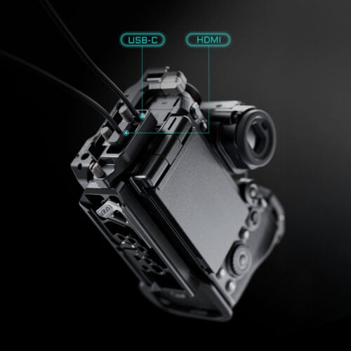 Die mitgelieferte HDMI- und USB-C-Kabelklemme sorgt dafür, dass beide Kabel sicher mit dem Kameragehäuse verbunden bleiben. Drei Kontaktpunkte zwischen Kamera und Käfig gewährleisten eine solide Verbindung zum Kameragehäuse und eine stabile Grundlage für die Montage von zusätzlichem Zubehör.