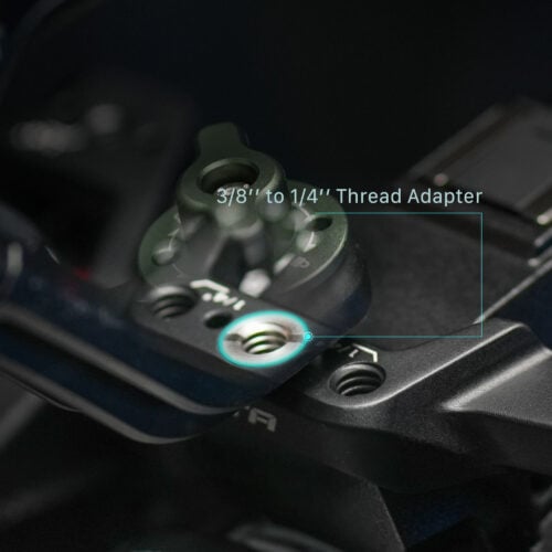 Dieser Kamerakäfig verfügt über Handgelenkriemenhalterungen, 1/4″-20-Gewinde mit Fixierungspunkten und einen 3/8″-16-zu-1/4″-20-Gewindeadapter.