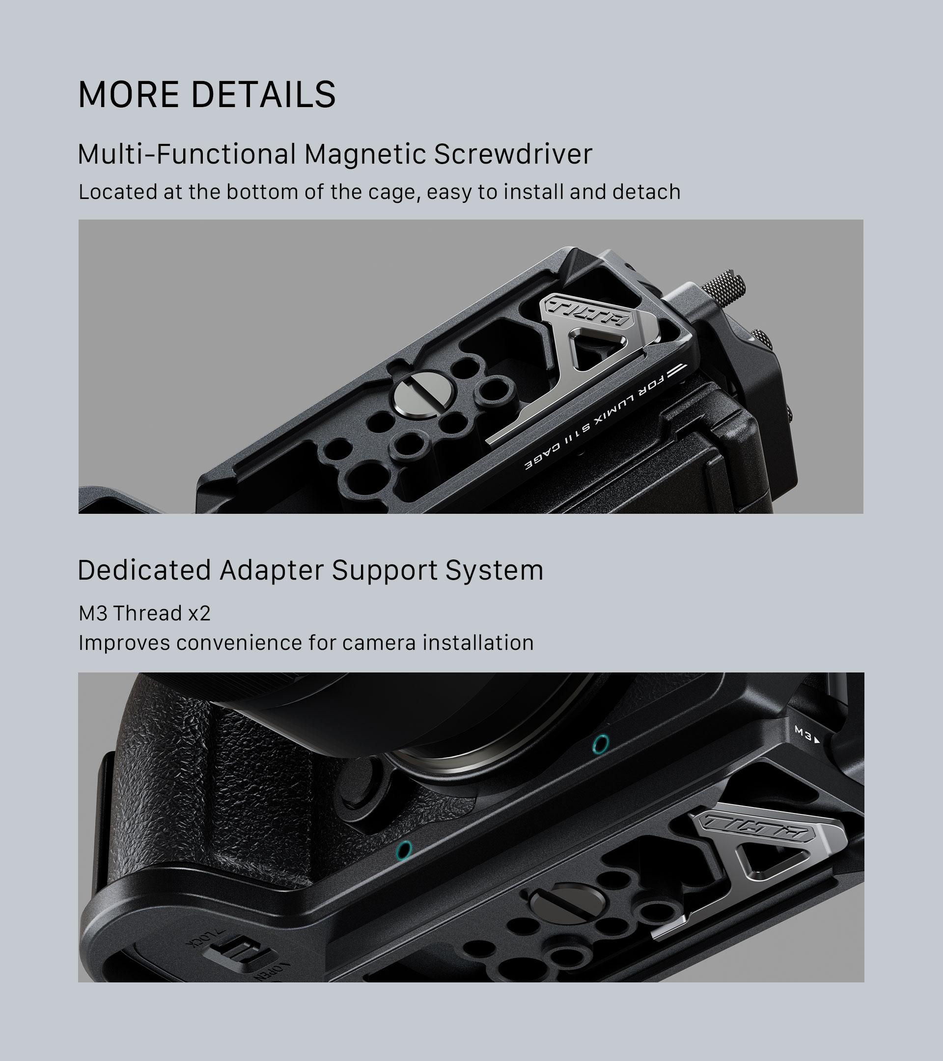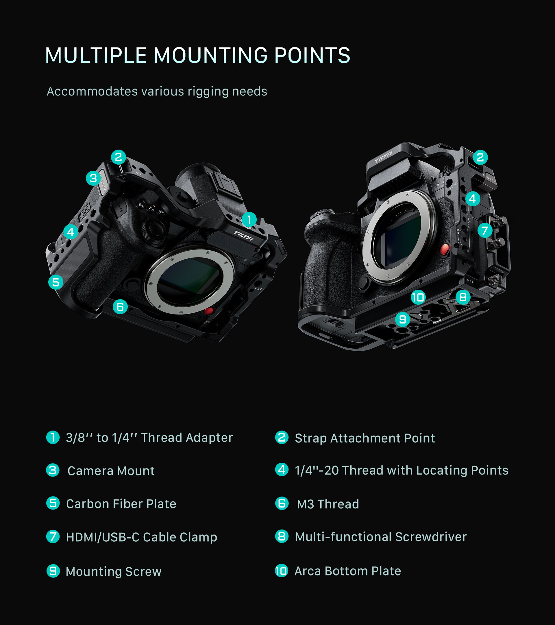Die Grundlage dieses Kits ist der Vollkamerakäfig, der Schutz bietet und die Befestigungsmöglichkeiten für die S1R II, Lumix S5 II, S5 IIX und G9 II erweitert.