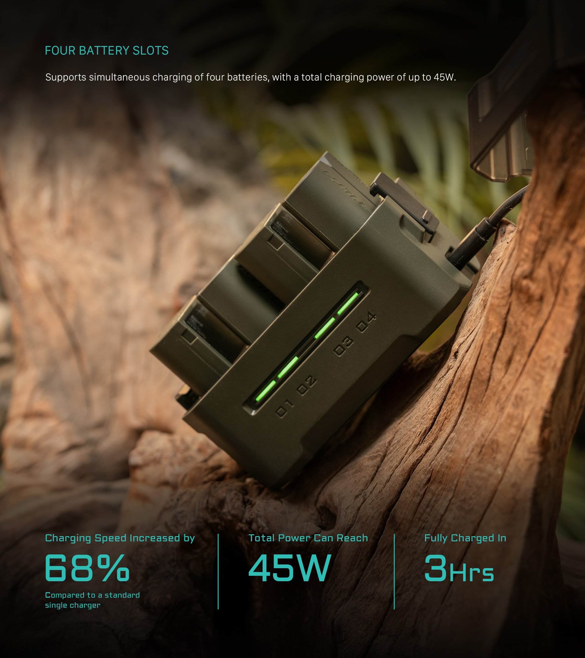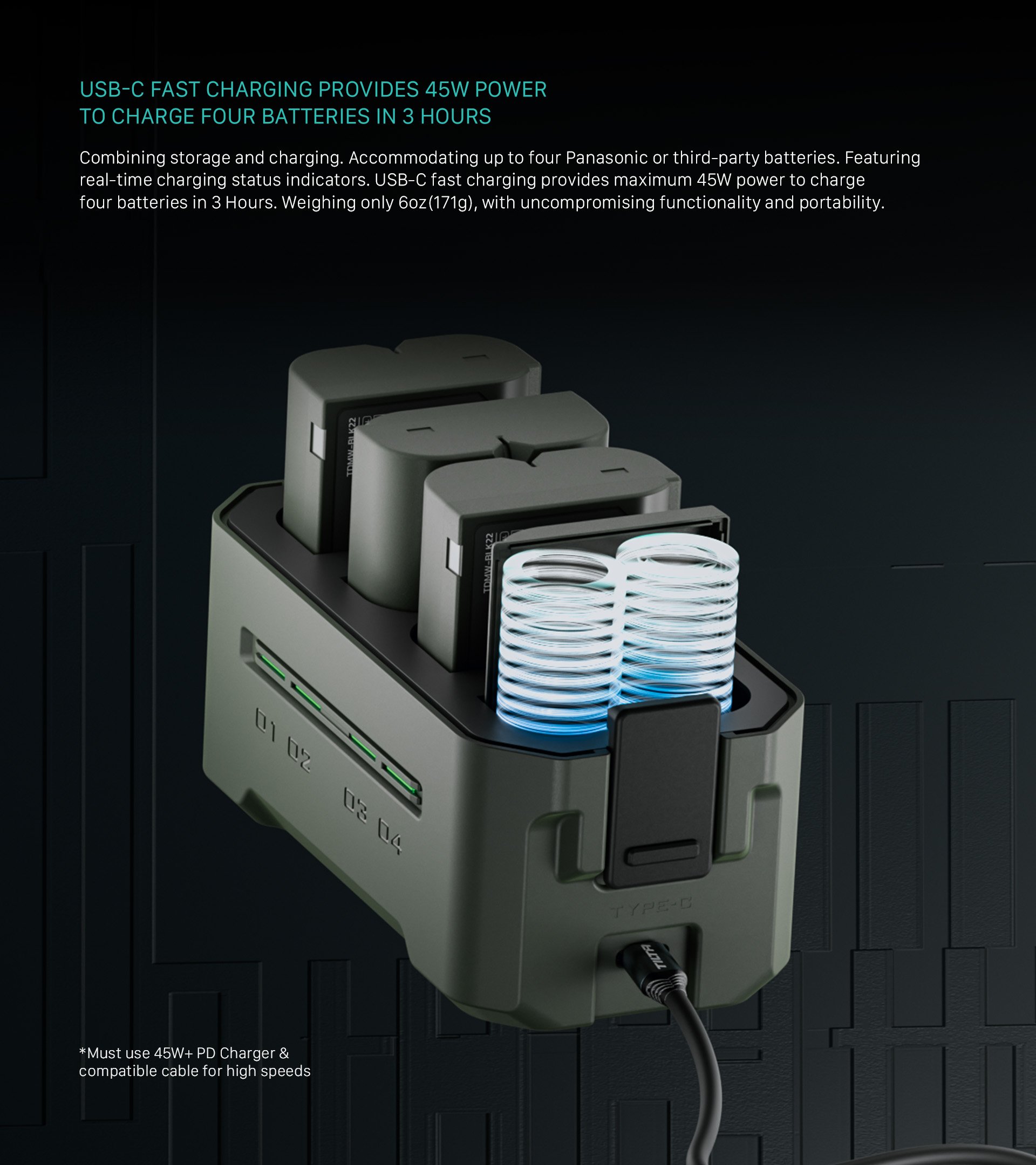 Diese kompakte Ladestation ist für die Akkus der DMW-BLK22 von Panasonic und anderen Herstellern geeignet und bietet vier Steckplätze für einfaches Aufladen und praktische Aufbewahrung. Ausgestattet mit 45W PD Fast Charging, liefert sie eine beeindruckende 68% schnellere Ladegeschwindigkeit als ein Standard-Einzel-Ladegerät und stellt sicher, dass Ihre Akkus in nur 3 Stunden einsatzbereit sind.