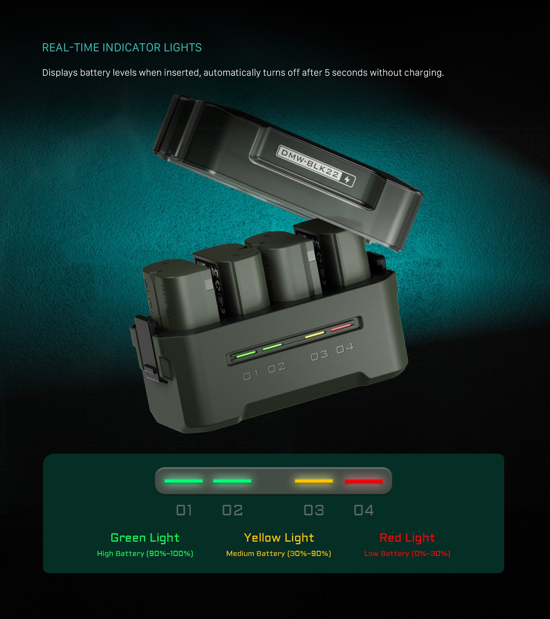 Mit der Möglichkeit, vier DMW-BLK22-Akkus vollständig aufzuladen, ist der Benutzer bereit für bis zu 13 Stunden Videoaufzeichnung oder genug Energie für 2.400 Fotos - perfekt für lange Aufnahmesessions.