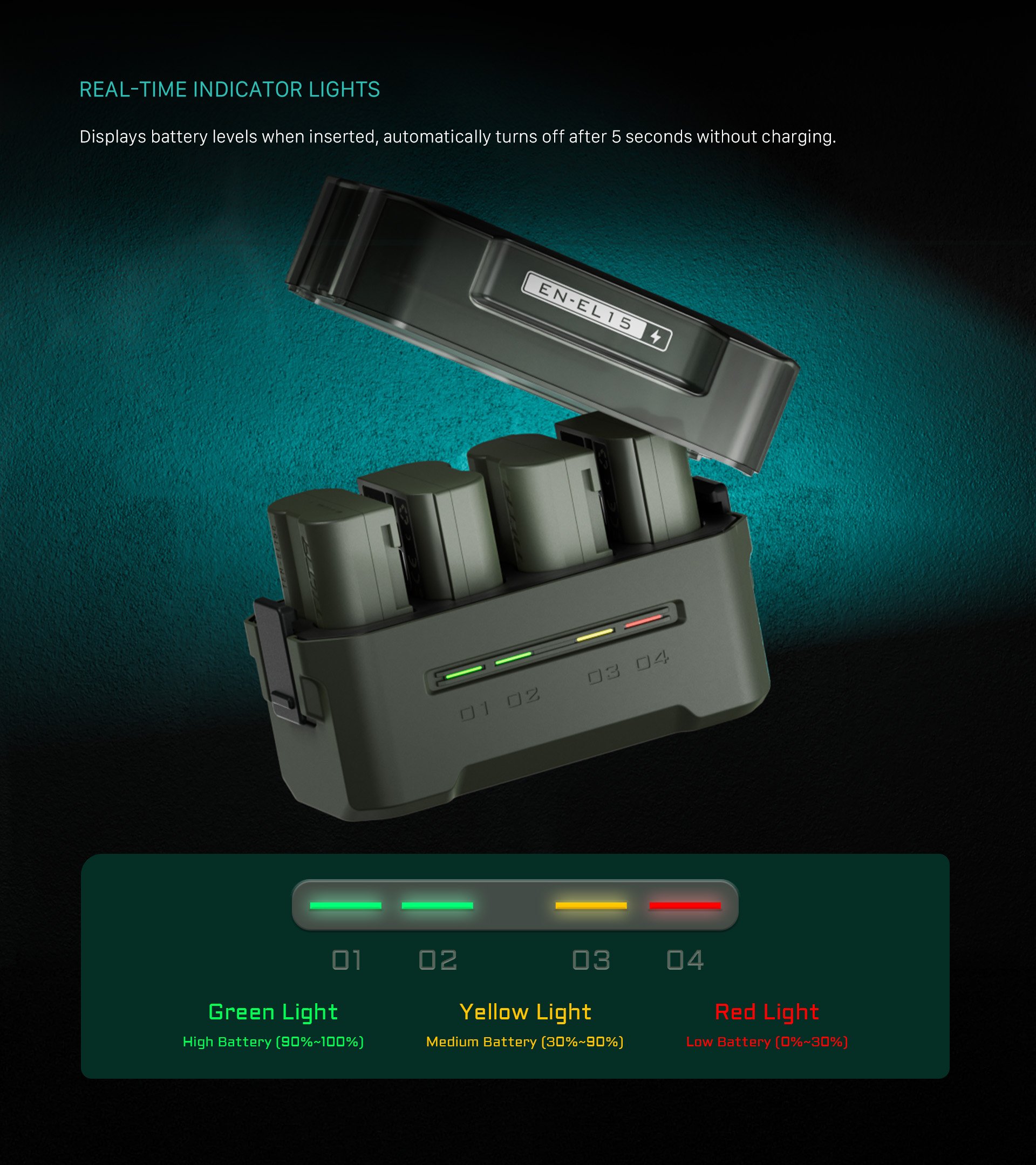 Diese kompakte Ladestation wurde für die Verwendung von EN-EL15C-Akkus von Nikon und anderen Herstellern entwickelt und bietet vier Steckplätze für einfaches Laden und praktische Aufbewahrung.