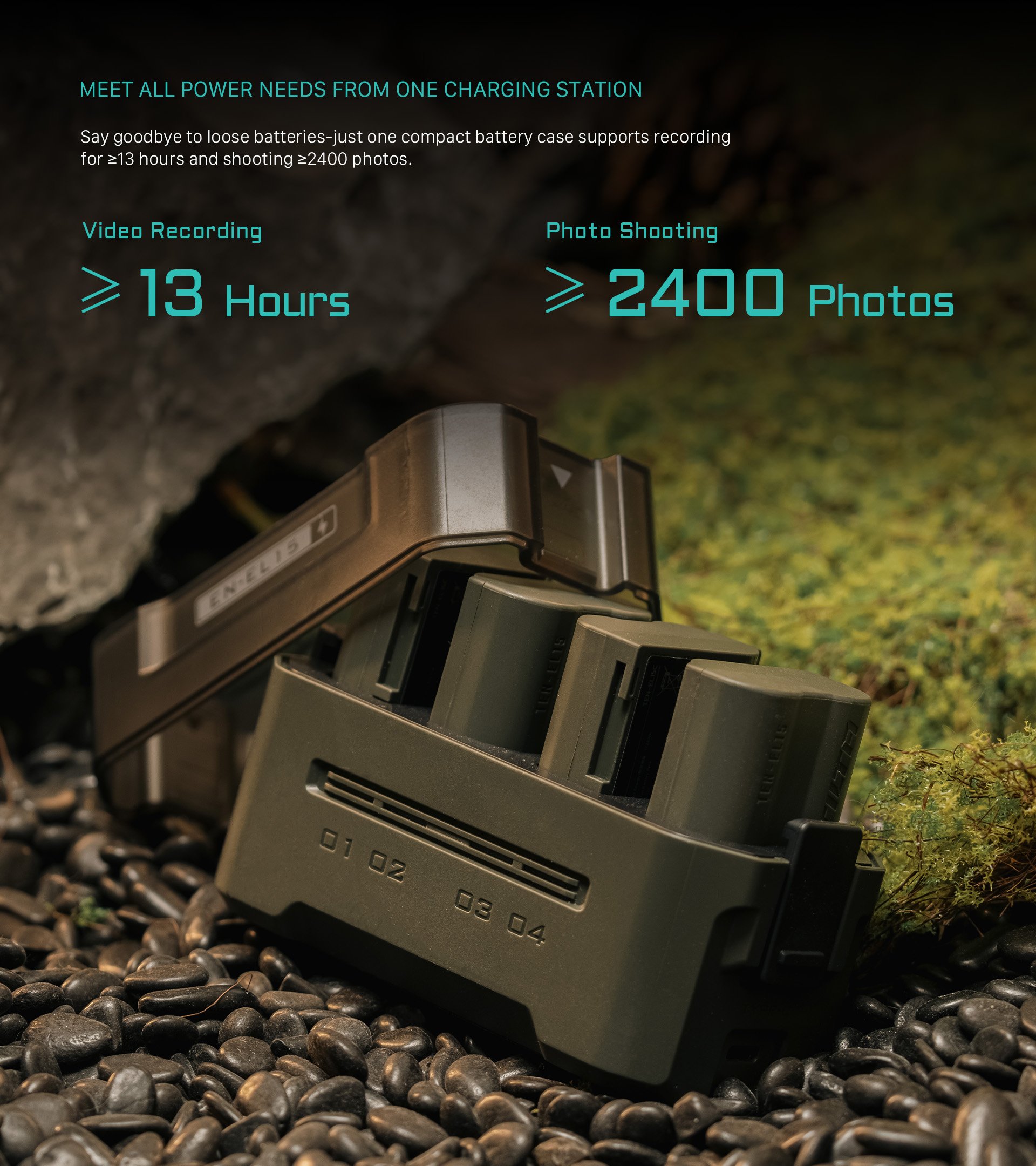Mit der Möglichkeit, vier EN-EL15C-Akkus vollständig aufzuladen, sind Benutzer für bis zu 13 Stunden Videoaufnahmen oder genug Energie für 2.400 Fotos bereit - perfekt für lange Aufnahmesessions.