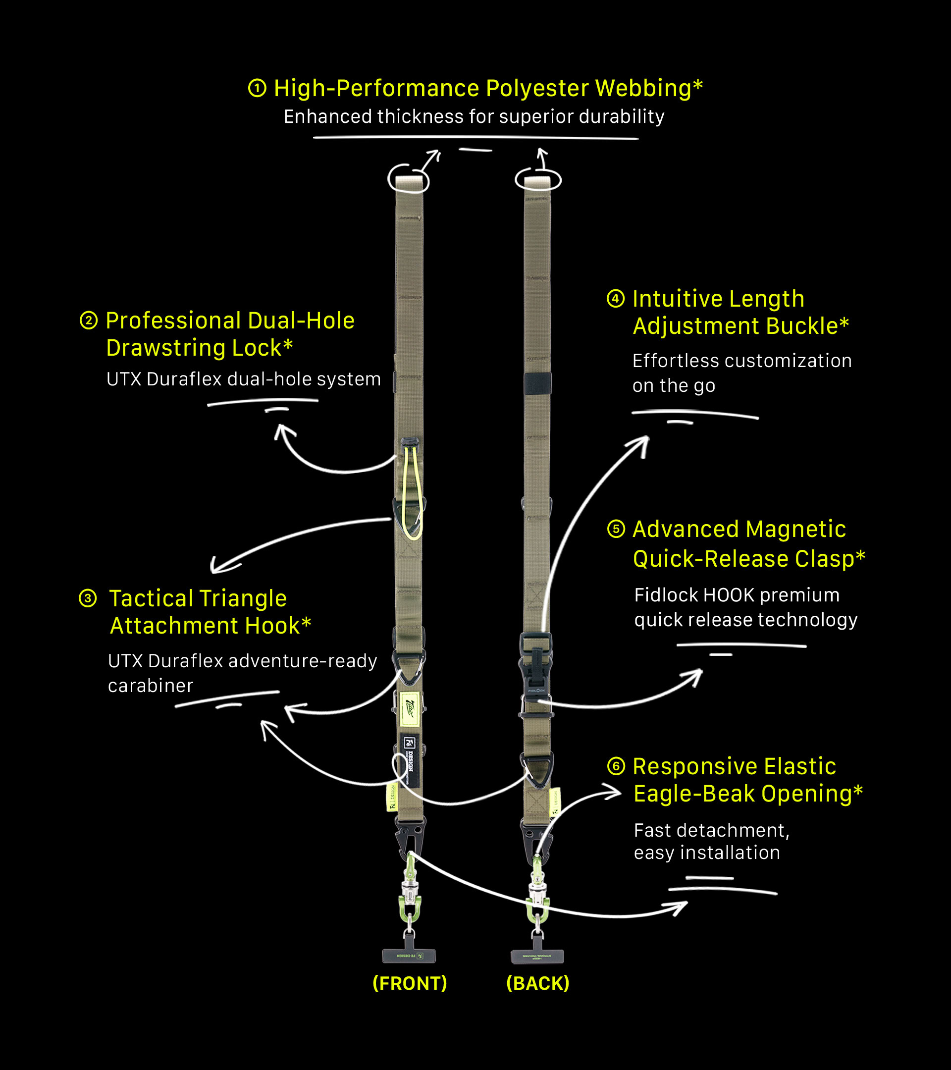 Er verfügt über ein professionelles UTX Duraflex Dual Drawstring Lock-System für verbesserte Sicherheit und taktische UTX Duraflex-Karabiner, mit denen dieser Gurt an einer Vielzahl von Kameras, Zubehörteilen und mehr befestigt werden kann.
