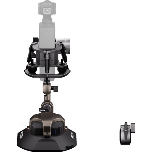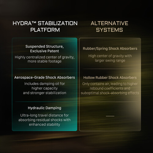 Der aus einer für die Luft- und Raumfahrt geeigneten Aluminiumlegierung gefertigte und präzise CNC-gefräste Bausatz wiegt nur 2,6 kg. Das hydraulische Dämpfungssystem verwendet Dämpfungsöl in Automobilqualität, das durch die Reduzierung von Mikrovibrationen eine Stabilisierung auf professionellem Niveau gewährleistet. Der mitgelieferte elektronische Saugnapf überwacht aktiv den Druck und passt die Saugkraft automatisch an. Der 2000-mAh-Akku hält bis zu 14 Stunden lang.
