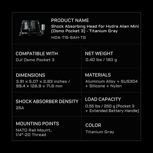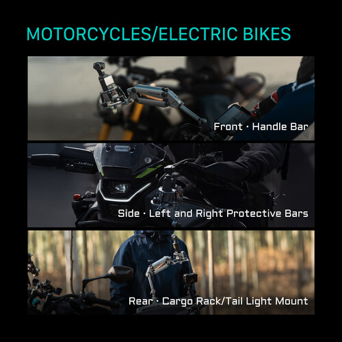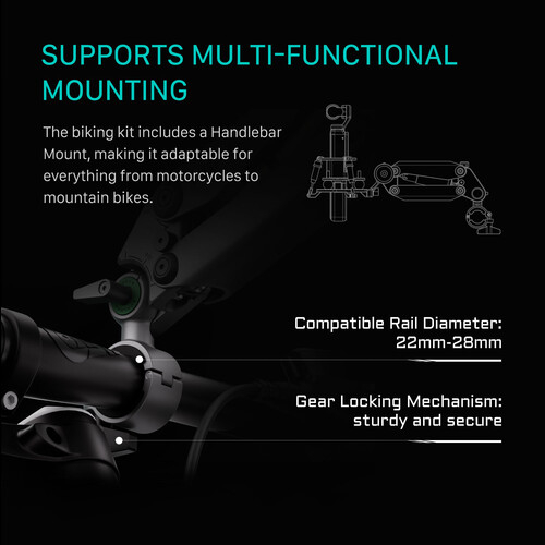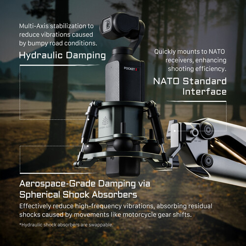 Die mehrachsige Hydra™-Stabilisierungsplattform isoliert zusätzlich hochfrequente Vibrationen und sorgt so für ruhige Aufnahmen auch in unwegsamem Gelände. Der stoßdämpfende Kopf ist für den DJI Osmo Pocket 3 optimiert, während die Lenkerhalterung Durchmesser von 22,2 mm und 28,8 mm unterstützt und somit an verschiedene Fahrzeugtypen angepasst werden kann.