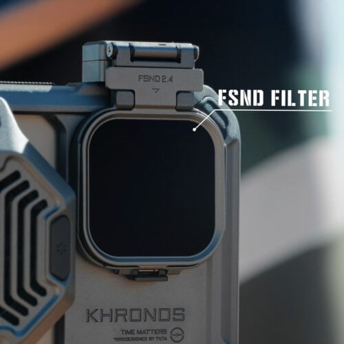 Die Filterablage lässt sich über eine sichere Magnetverbindung einfach an der Khronos-Tasche befestigen und verfügt über eine schwenkbare Halterung, mit der sich die Ablage über alle drei Linsen des iPhone 16 Pro/Pro Max klappen lässt.