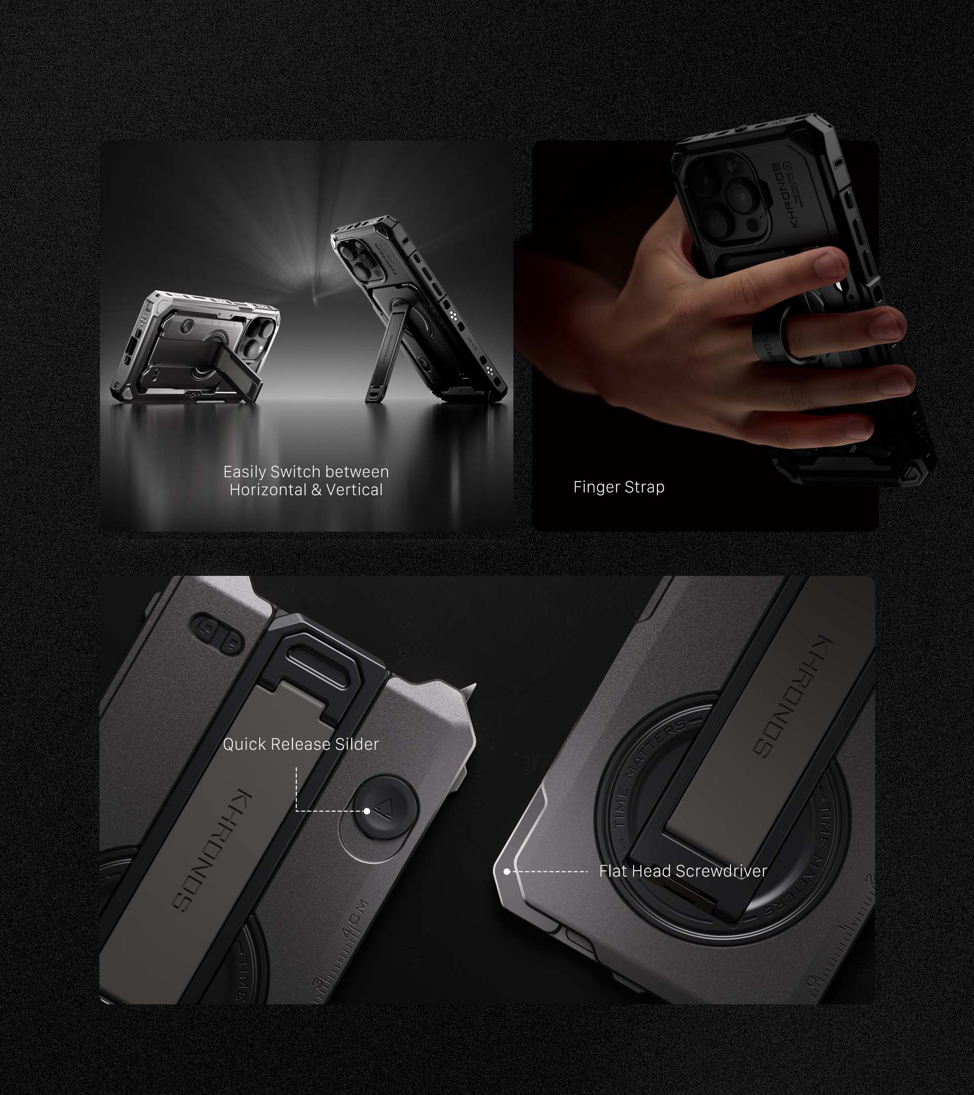 Diese vom Kamerakäfig inspirierte Smartphone-Hülle wurde sorgfältig für beide iPhone 16-Modelle entwickelt und bietet eine unvergleichliche Mischung aus Funktionalität und Eleganz. Die Khronos-Hülle schützt Ihr Smartphone zuverlässig vor täglicher Abnutzung, ohne dabei Kompromisse bei Stil und Funktionalität einzugehen.