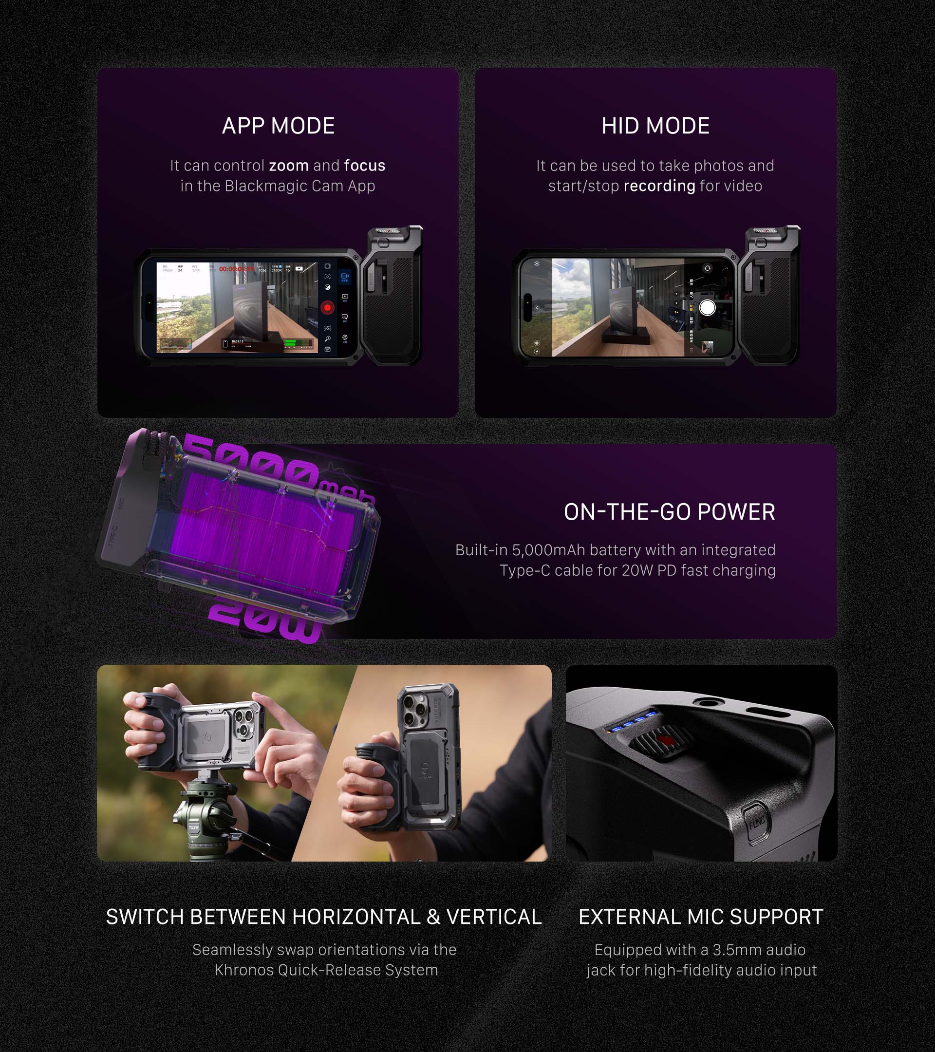 Der Griff wird über ein integriertes USB-C-Kabel an ein iPhone 16 angeschlossen und nutzt Bluetooth, um den Fokus oder Zoom über das Rad an der Vorderseite des Griffs zu steuern. Dies sorgt auch für mehr Stabilität bei der Bedienung des Systems und die Aufnahmetaste stellt sicher, dass der Benutzer den Handgriff nicht loslassen muss, um die Aufnahme zu starten.