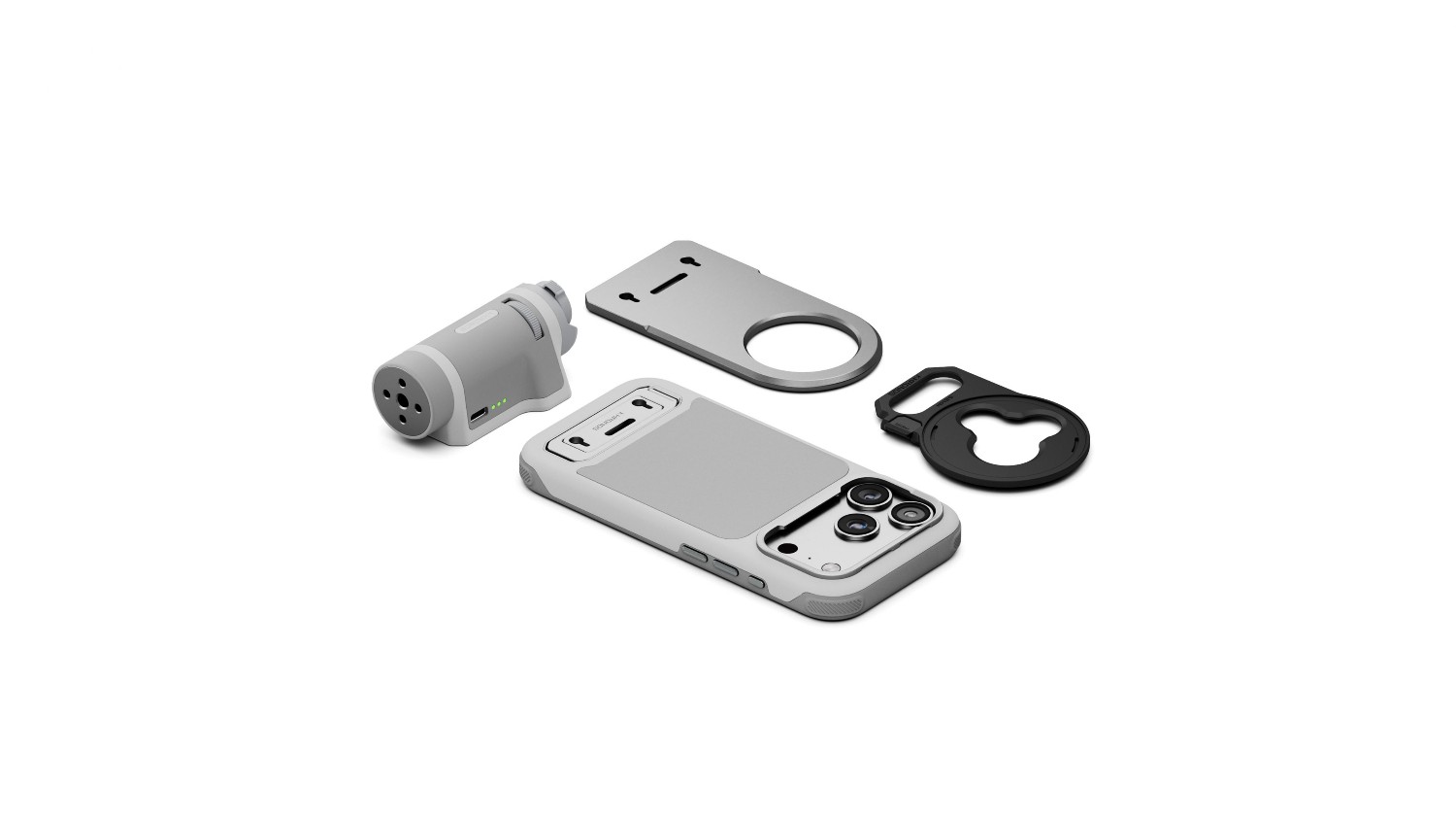Das Tilta Khronos Lite Handheld Kit in Hellgrau ist ein speziell entwickeltes, leichtes Rig für das iPhone 17 Pro, das professionelle Leistung in einem kompakten Paket bietet. Es verfügt über einen ergonomischen Griff mit Bluetooth-Steuerung für Fokus und Zoom, eine magnetische Rückplatte für Zubehör und ist mit 58-mm-Filtern kompatibel.
