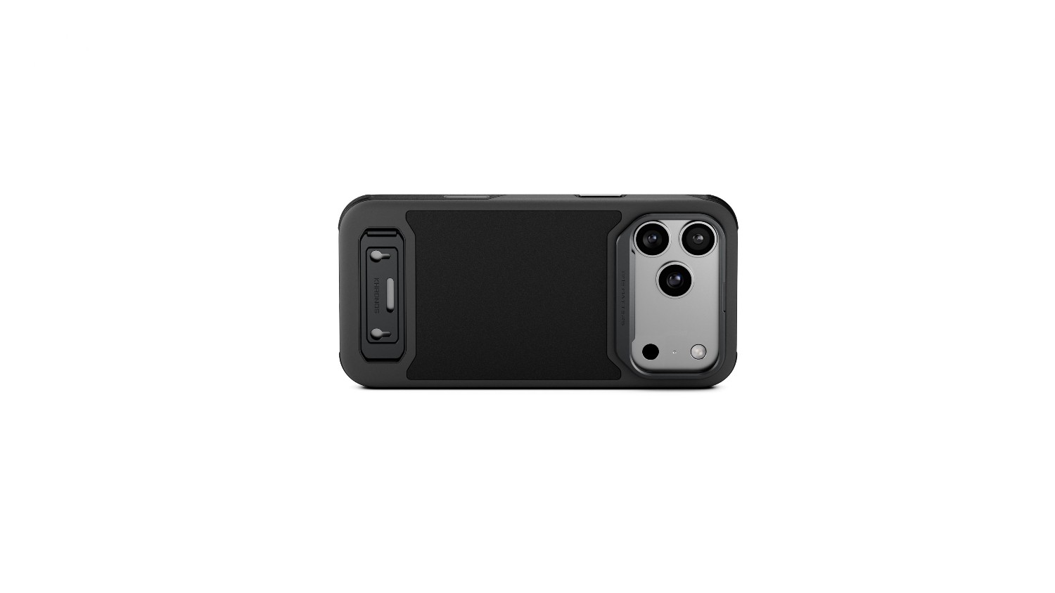 Das Tilta Khronos Lite Case in Schwarz ist eine leichte, professionelle Schutzhülle für das iPhone 17 Pro Max. Es verfügt über einen integrierten Ständer für freihändiges Betrachten, eine magnetische Rückseite zum Anbringen von Zubehör und verstärkten Schutz für die Kamera und die Ecken.