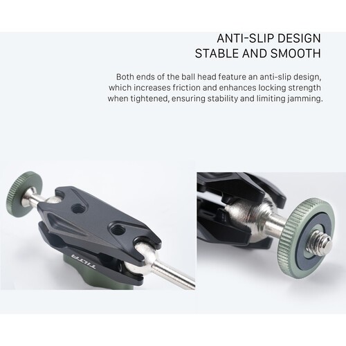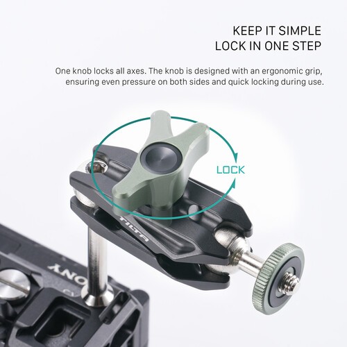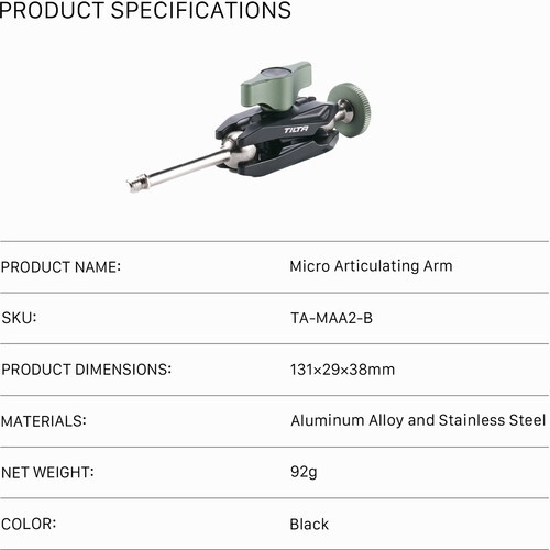 Der Tilta Micro Articulating Arm ist ein kompakter und vielseitiger 5,2-Zoll-Arm, der für die Befestigung von Zubehör wie Monitoren oder Leuchten an Ihrem Kamerastativ entwickelt wurde. Er besteht aus einer robusten Aluminiumlegierung und Stahl, verfügt an jedem Ende über eine 1/4"-20-Schraube und hat eine Tragkraft von 5 lbs.