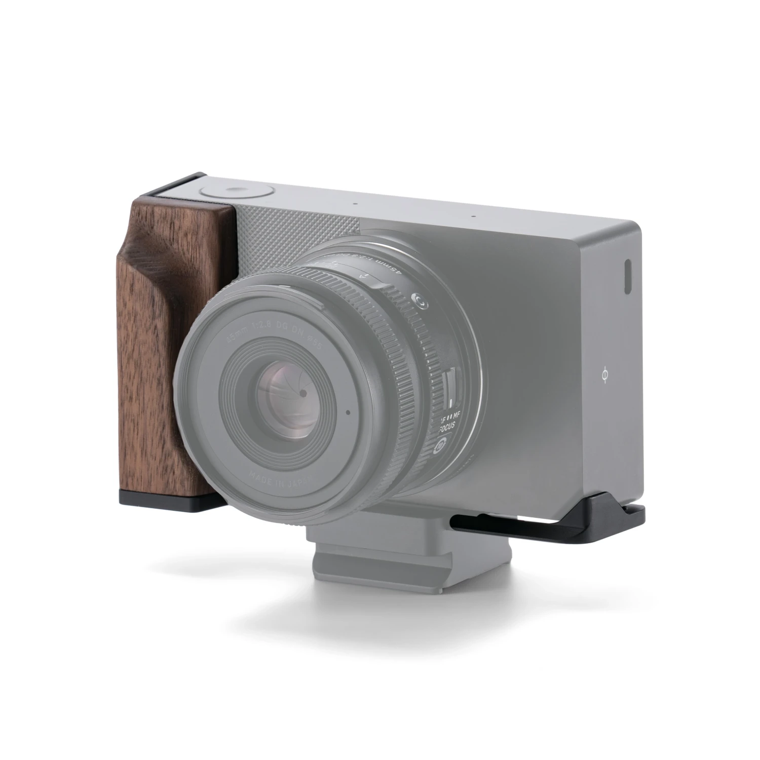 Wir stellen vor: die Montageplatte mit Holzgriff für die Sigma BF. Die Basis dieses L-förmigen Zubehörs ist ein Handgriff aus Walnussholz. Dieser sorgt für eine komfortablere Bedienung und Handhabung der Kamera, während sie gleichzeitig kompakt und reisefreundlich bleibt.