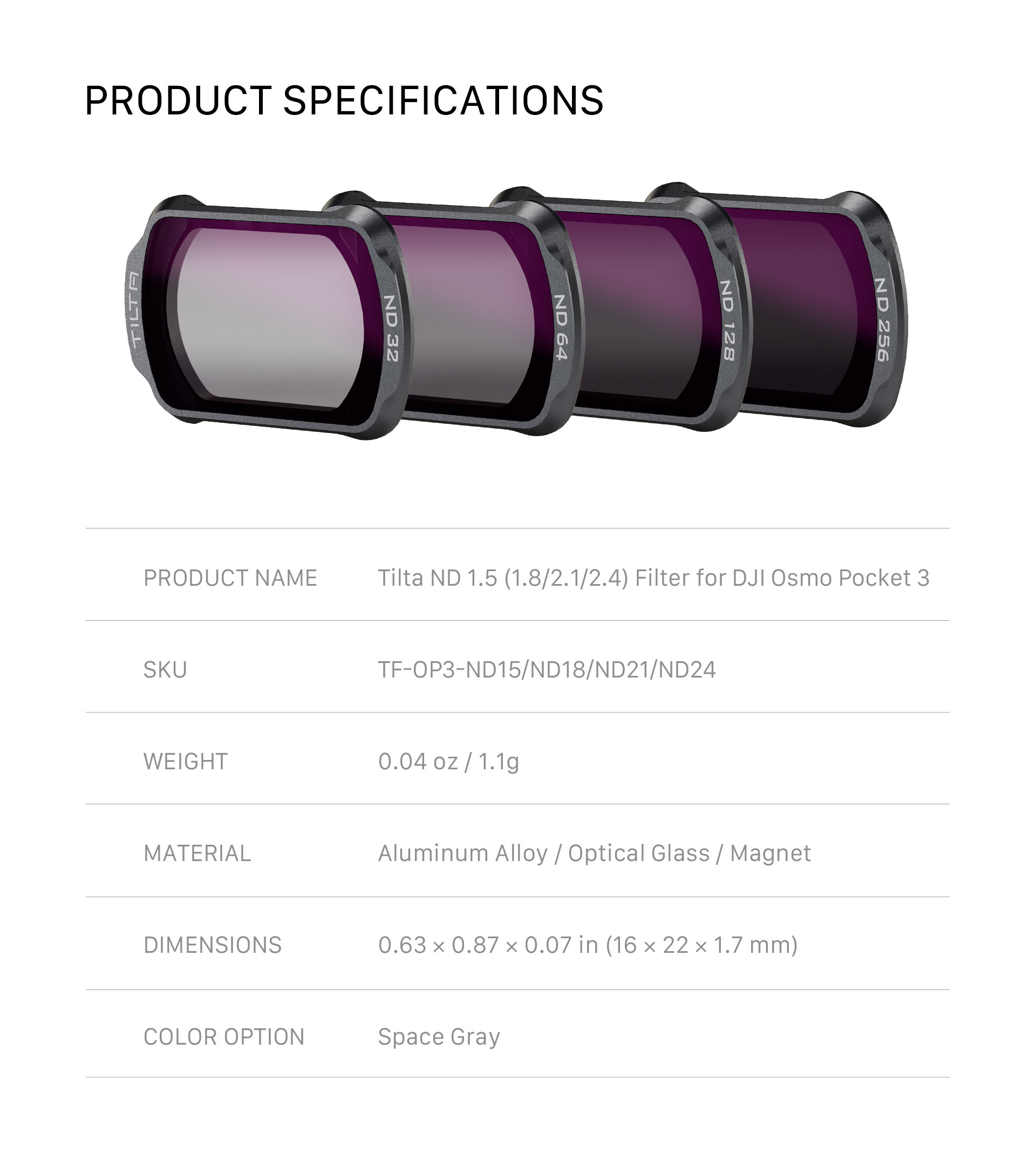 Die speziell für den Pocket 3 entwickelten Filter verfügen über eine magnetische Verbindung für eine mühelose Verbindung und das gerillte Quick-Release-Design, das einen schnellen Zugriff durch Einklemmen ermöglicht.
