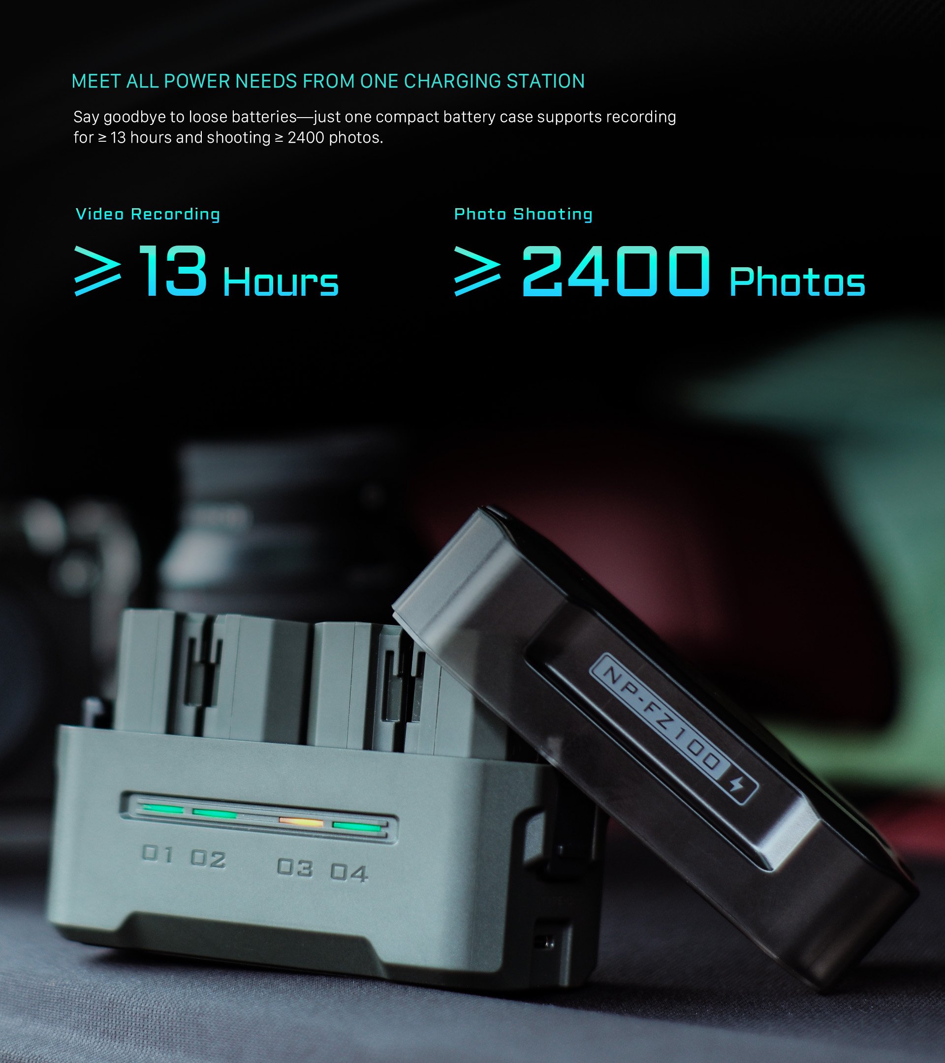 Mit der Möglichkeit, vier NP-FZ100-Akkus vollständig aufzuladen, ist der Benutzer für bis zu 13 Stunden Videoaufnahmen oder 2.400 Fotos gerüstet - perfekt für lange Aufnahmesessions.
