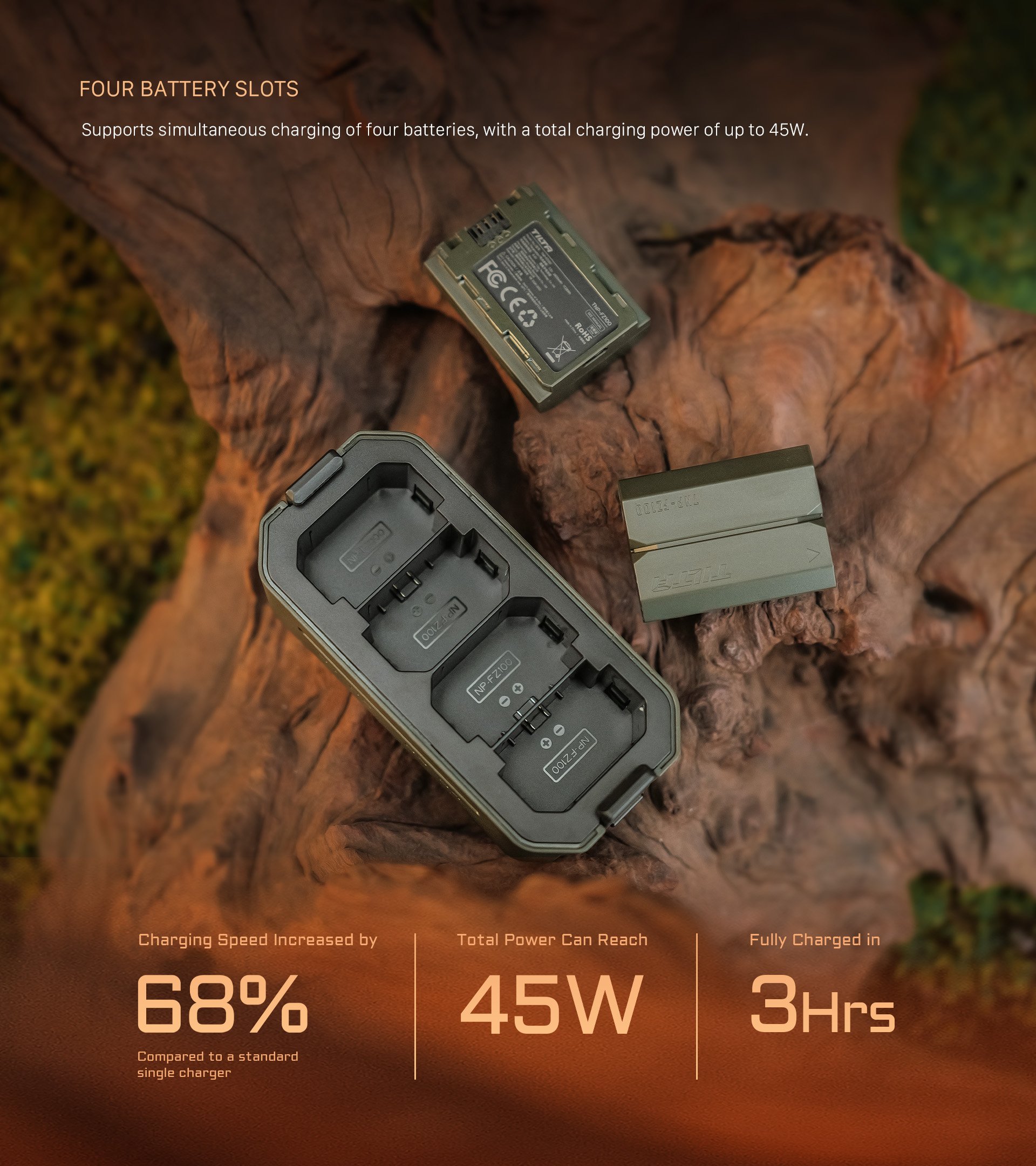 Ausgestattet mit 45W PD Fast Charging liefert sie eine beeindruckende, 68% schnellere Ladegeschwindigkeit als ein Standard-Einzel-Ladegerät und sorgt dafür, dass Ihre Akkus in nur 3 Stunden einsatzbereit sind.