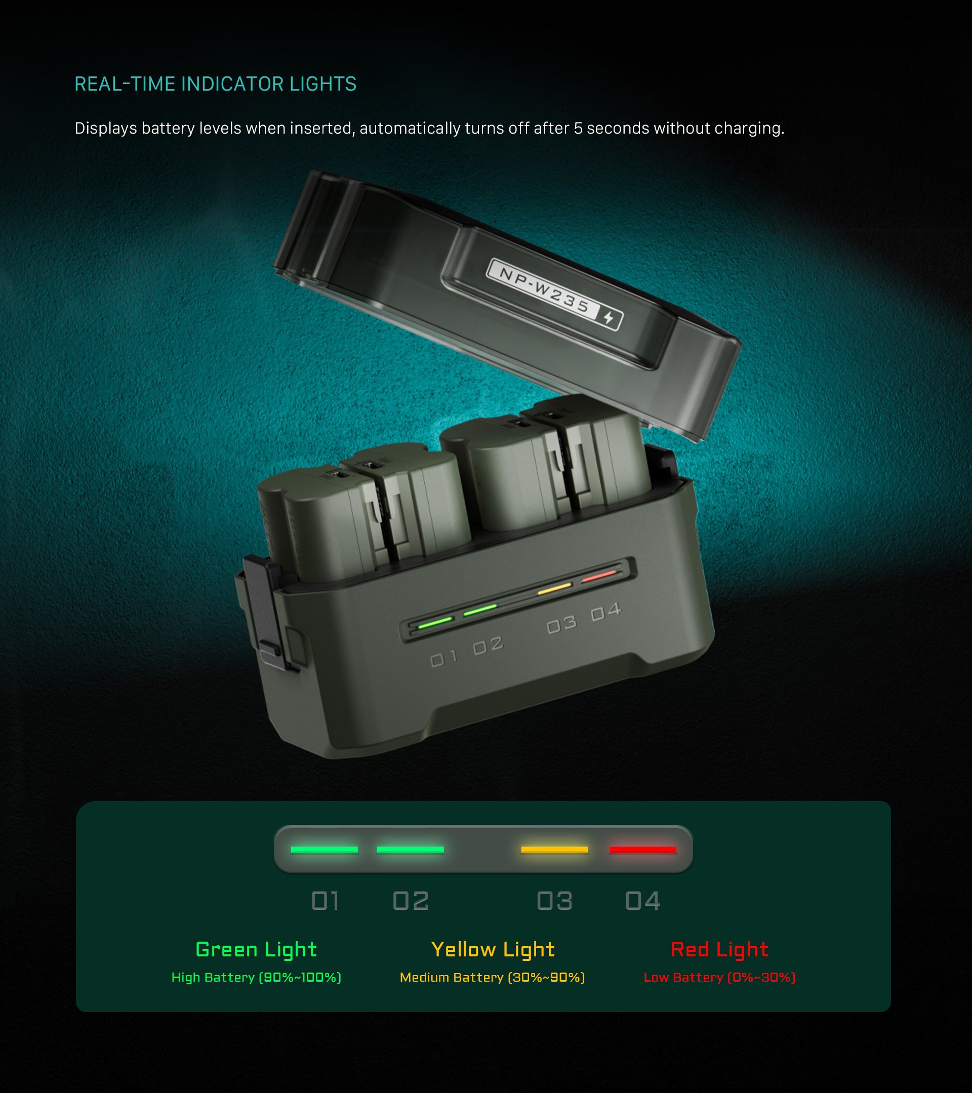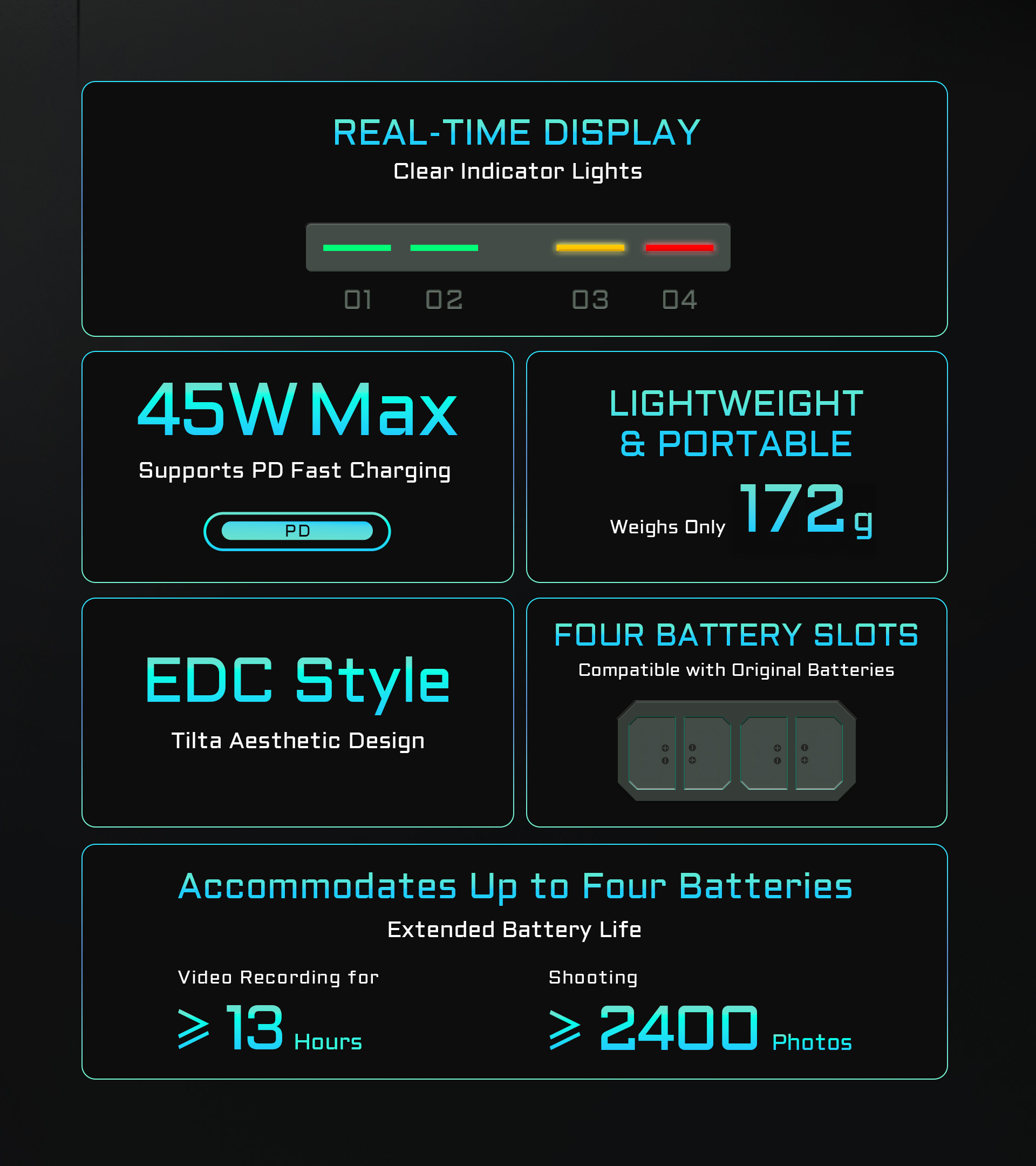 Echtzeit-Ladestatusanzeigen informieren Sie über den Status der einzelnen Akkus, und dank des leichten Designs wiegt das Gerät nur 176 Gramm, so dass Sie es problemlos mitnehmen können.