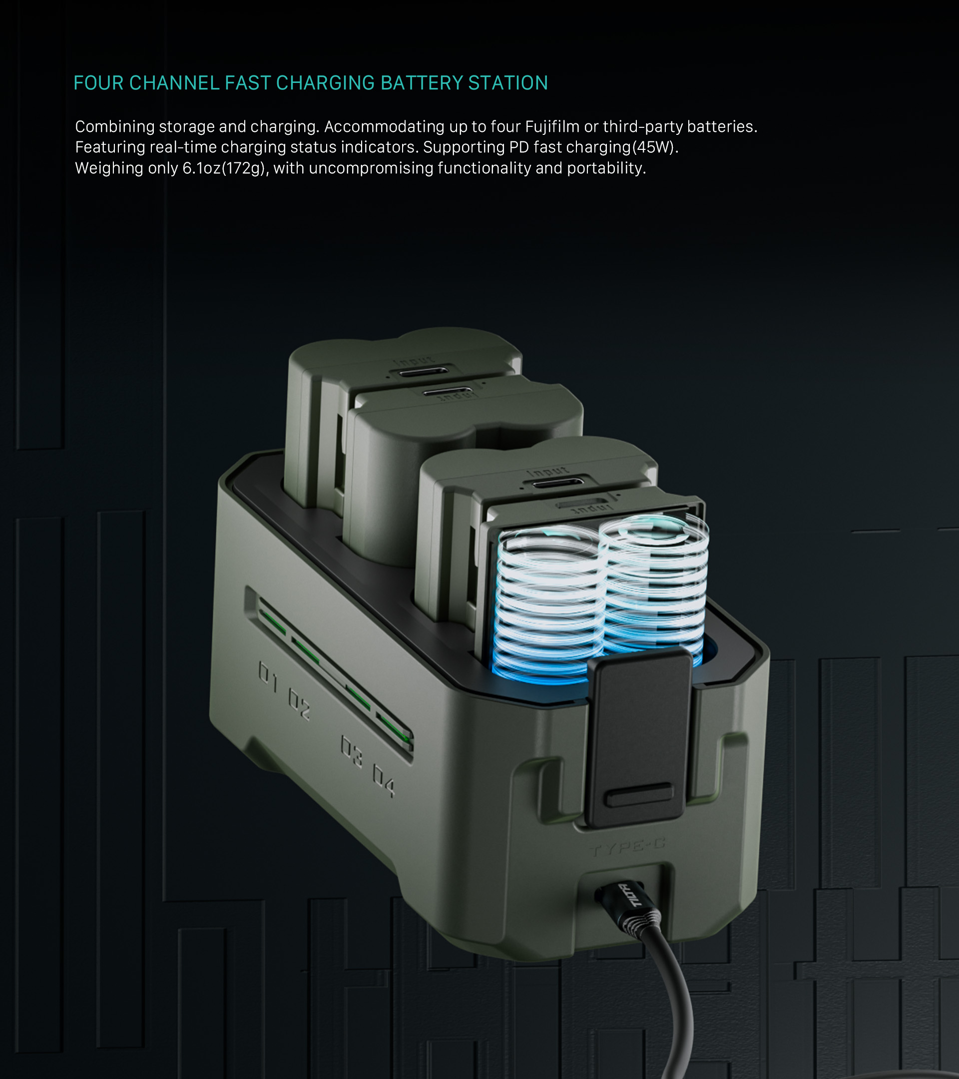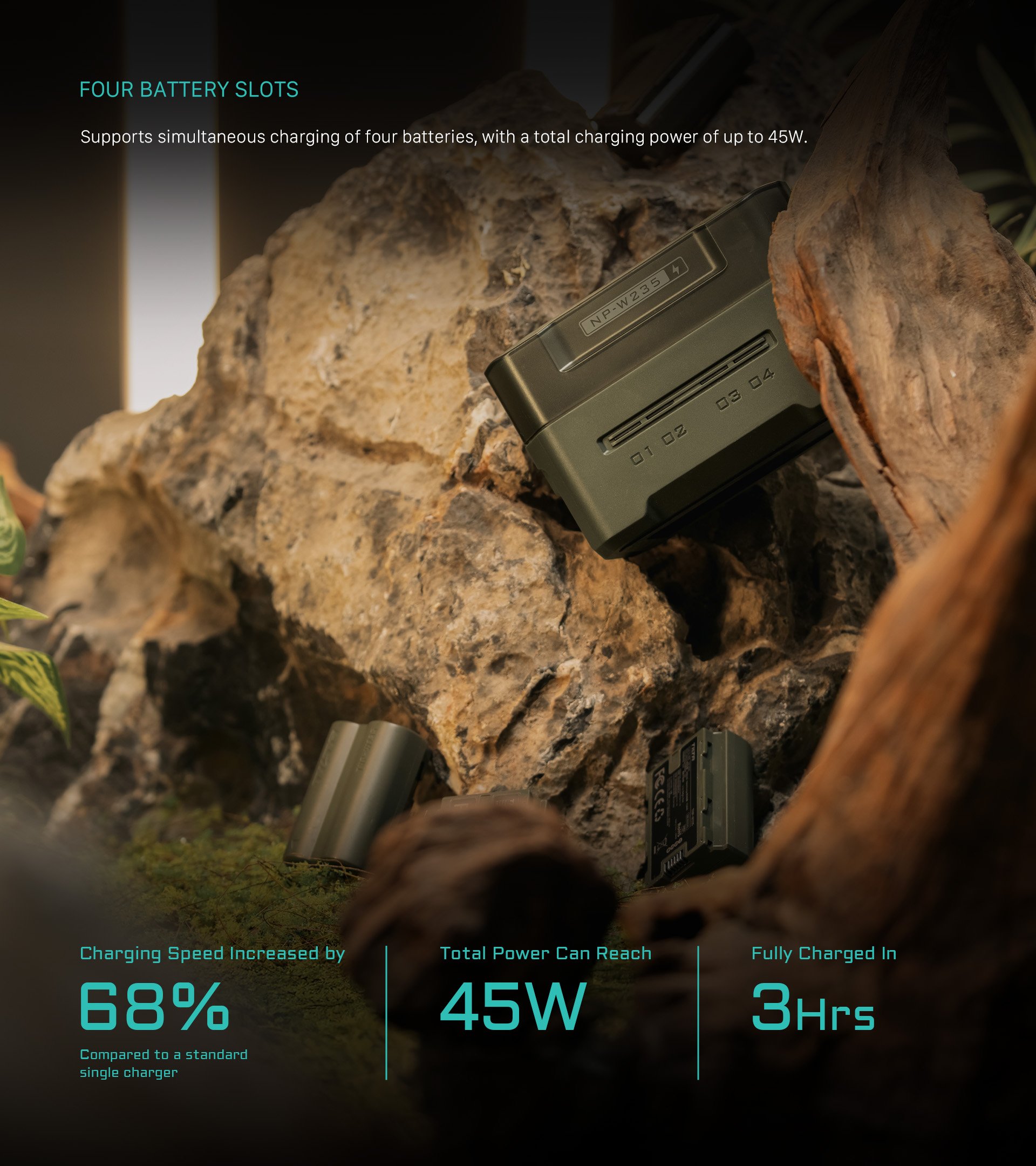 Diese kompakte Ladestation Battery Kit (4 Akkus) ist für Akkus von Fujifilm und anderen Herstellern (NP-W235) geeignet und bietet vier Steckplätze für einfaches Aufladen und praktische Aufbewahrung. Ausgestattet mit 45W PD Fast Charging, liefert es eine beeindruckende 68% schnellere Ladegeschwindigkeit als ein Standard-Einzel-Ladegerät und stellt sicher, dass Ihre Akkus in nur 3 Stunden wieder einsatzbereit sind.