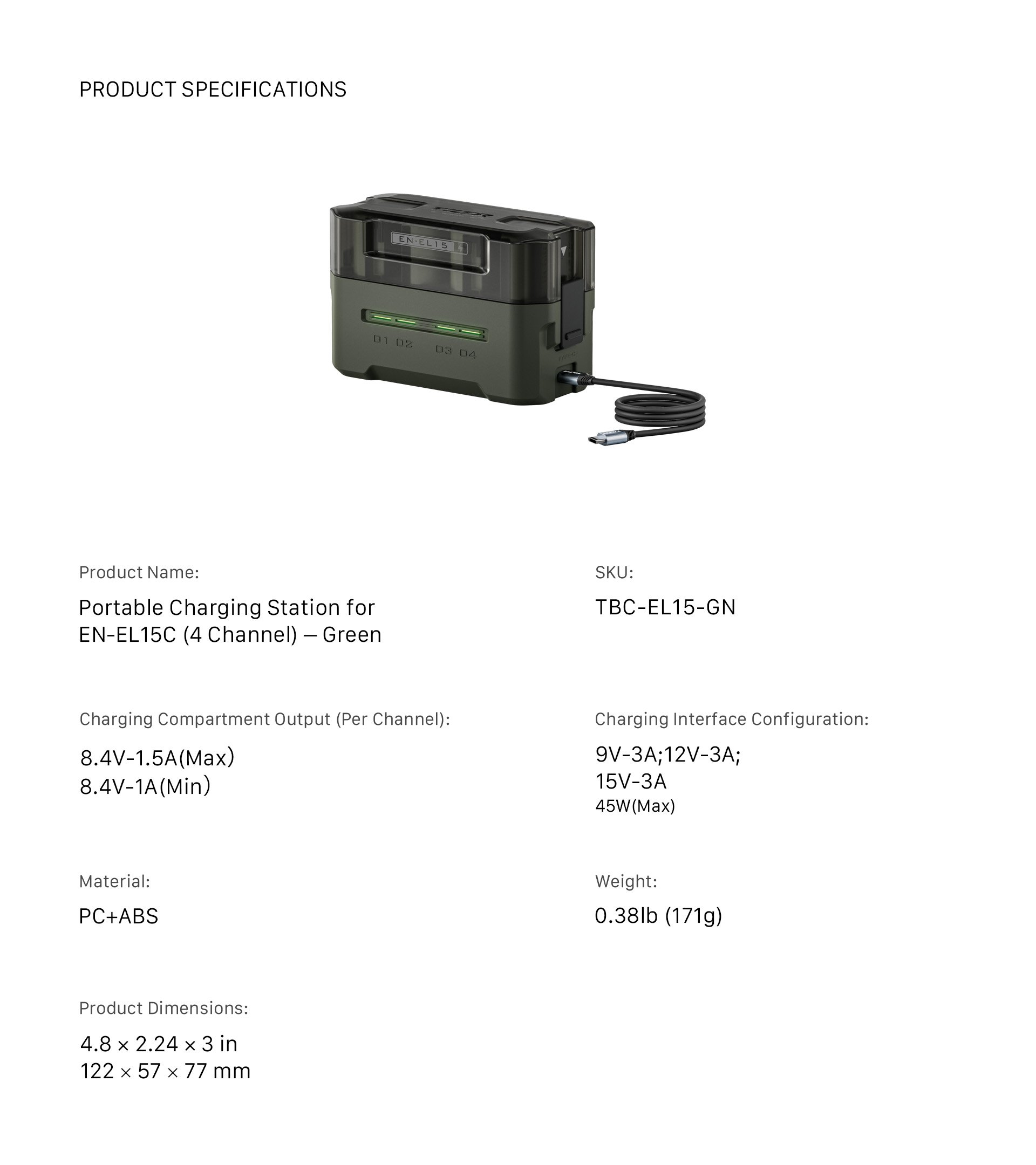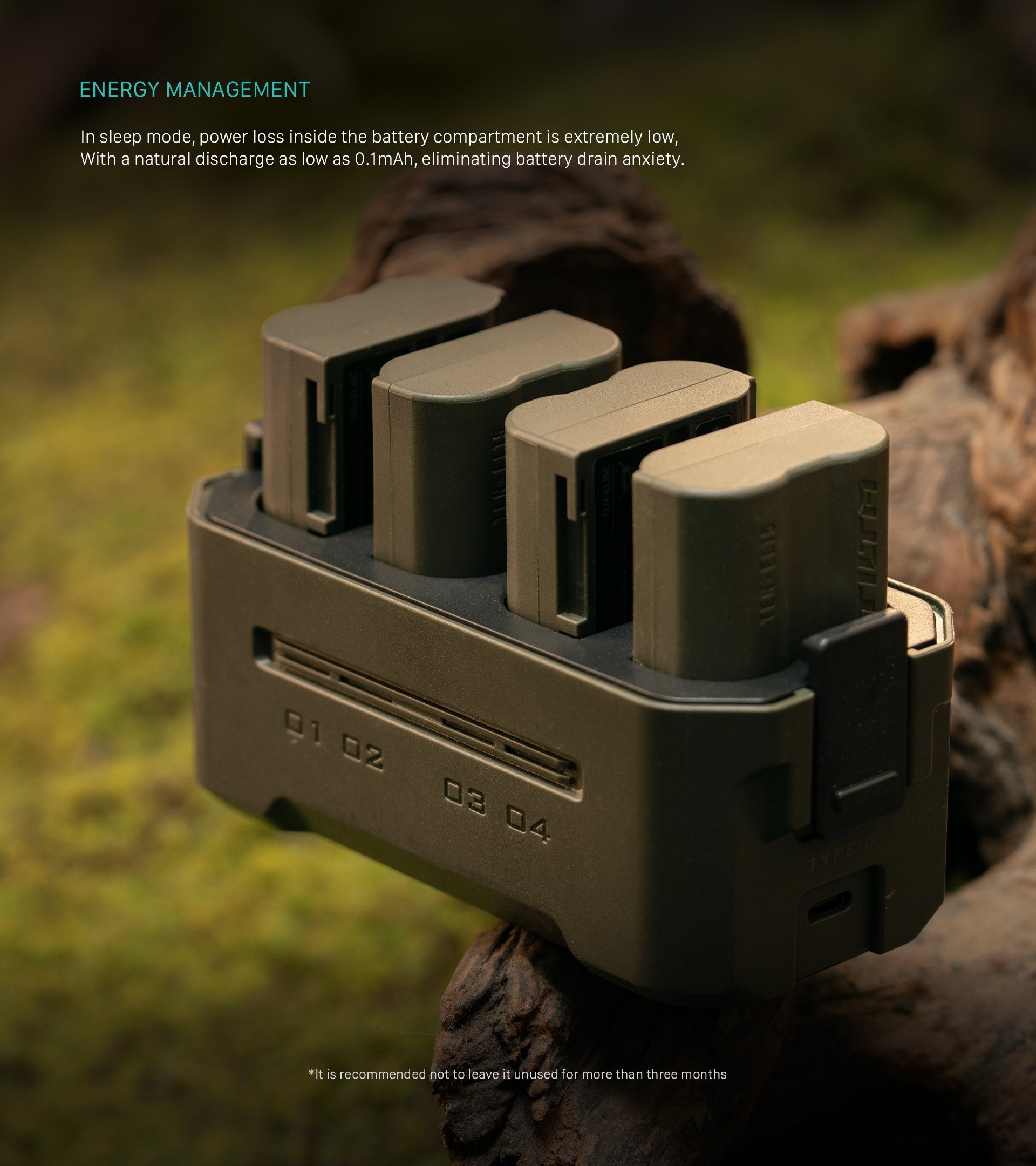Diese kompakte Ladestation wurde für die Verwendung von EN-EL15C-Akkus von Nikon und anderen Herstellern entwickelt und bietet vier Steckplätze für einfaches Laden und praktische Aufbewahrung.
