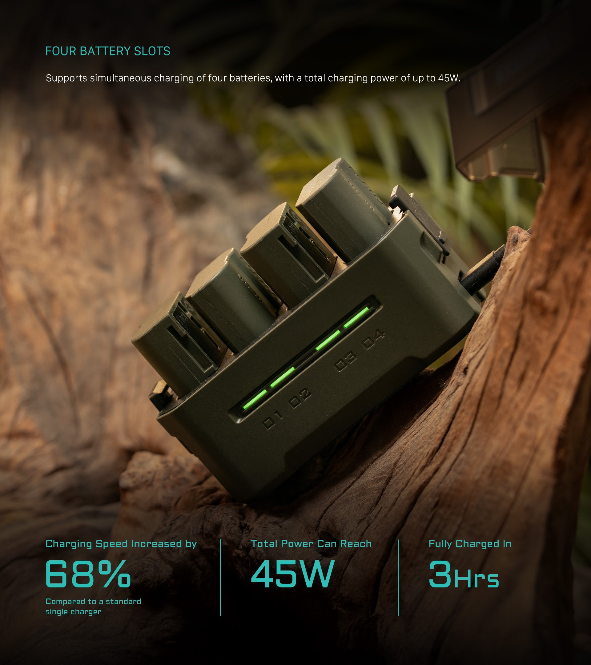 Diese kompakte Ladestation ist für EN-EL15C-Akkus von Nikon und anderen Herstellern geeignet und bietet vier Steckplätze für einfaches Laden und praktische Aufbewahrung. Ausgestattet mit 45W PD Fast Charging, liefert sie eine beeindruckende 68% schnellere Ladegeschwindigkeit als ein Standard-Einzel-Ladegerät und stellt sicher, dass Ihre Akkus in nur 3 Stunden einsatzbereit sind.