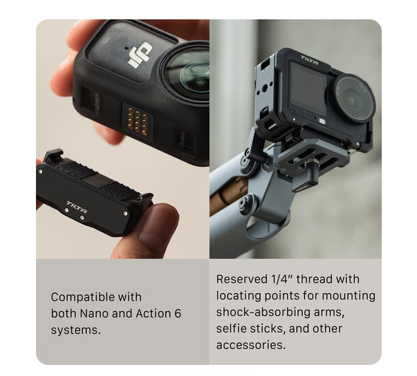 Die Tilta TA-T95-QRMB-TG Schnellwechsel-Montageplatte ist eine magnetische, bidirektionale Befestigungslösung, die speziell für die DJI Osmo Action 6 und Nano entwickelt wurde. Sie ermöglicht eine schnelle Befestigung, flexible Ausrichtung und verfügt über ein integriertes 1/4″-20-Gewinde für die Montage von zusätzlichem Zubehör.