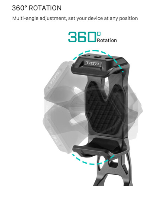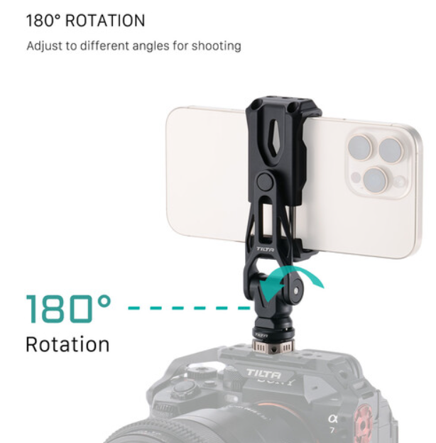 Der Tilta TA-PMB5-CSK-B ist eine komplette, einsatzbereite, drehbare Smartphone-Halterung, die die V2 360°-Smartphone-Klemme (für Smartphones mit einer Breite von 7,6 bis 9,7 cm) mit einem integrierten Kaltschuhadapter kombiniert, sodass Sie Ihr Smartphone sofort auf jeden Kamerablitzschuh, Käfig-Kaltschuh oder oberen Griff schieben können, um es als Regiemonitor, Bildausrichtungshilfe, Live-Stream-Display oder Halterung für einen drahtlosen Empfänger verwenden können – alles mit vollständiger Drehbarkeit von Hoch- zu Querformat und einer stabilen, verdrehsicheren Verbindung.