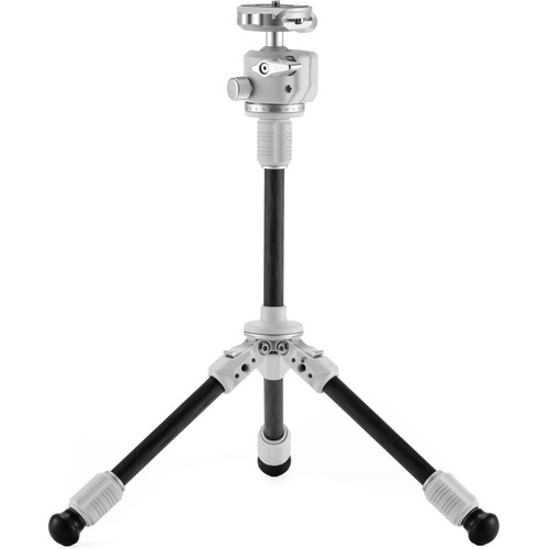 Die zweiteiligen Kohlefaserbeine verfügen über ein Twist-Lock-System, mit dem die Arbeitshöhe von 10,8" auf großzügige 21,9" erweitert werden kann, was Optionen für verschiedene Winkel und Perspektiven bietet. Zusammengeklappt misst das Stativ nur 11,1" in der Länge und lässt sich somit leicht in jeder Ausrüstungstasche verstauen. Der um 360° schwenkbare Kugelkopf des Stativs sorgt für sanfte, präzise Bewegungen und ermöglicht so schnelle Anpassungen und Panoramaaufnahmen.