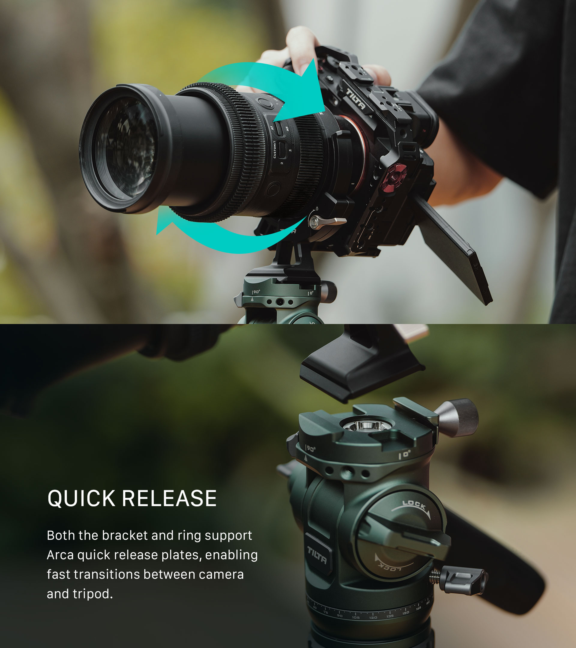 Dieses leichte, auf Arca basierende Zubehör ermöglicht dem Benutzer den sofortigen Wechsel zwischen horizontalen und vertikalen Aufnahmekonfigurationen.