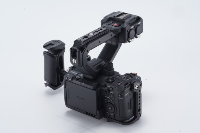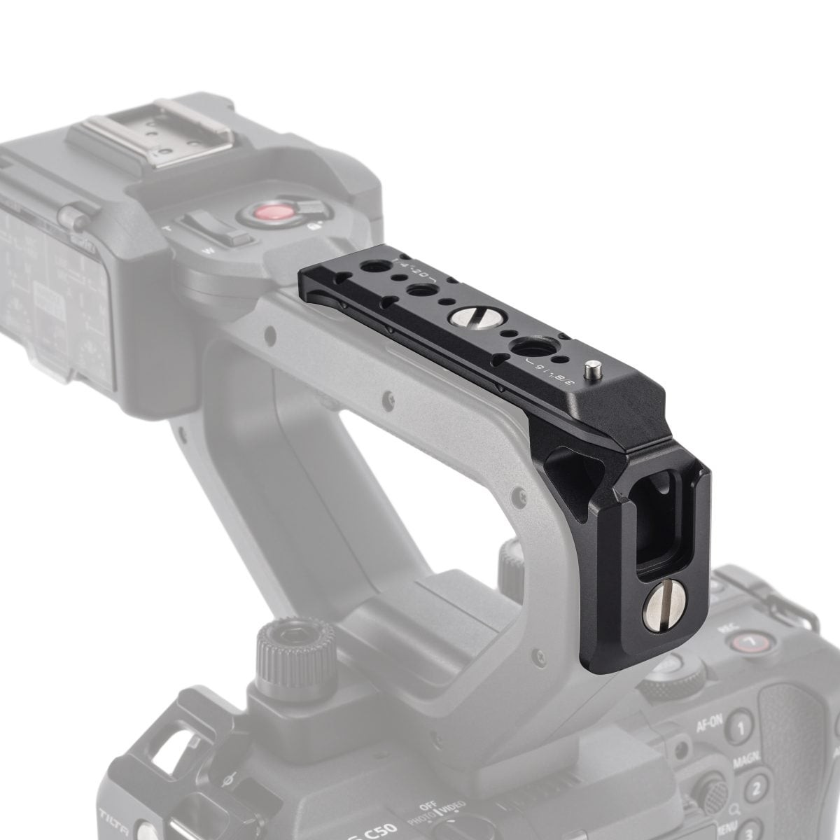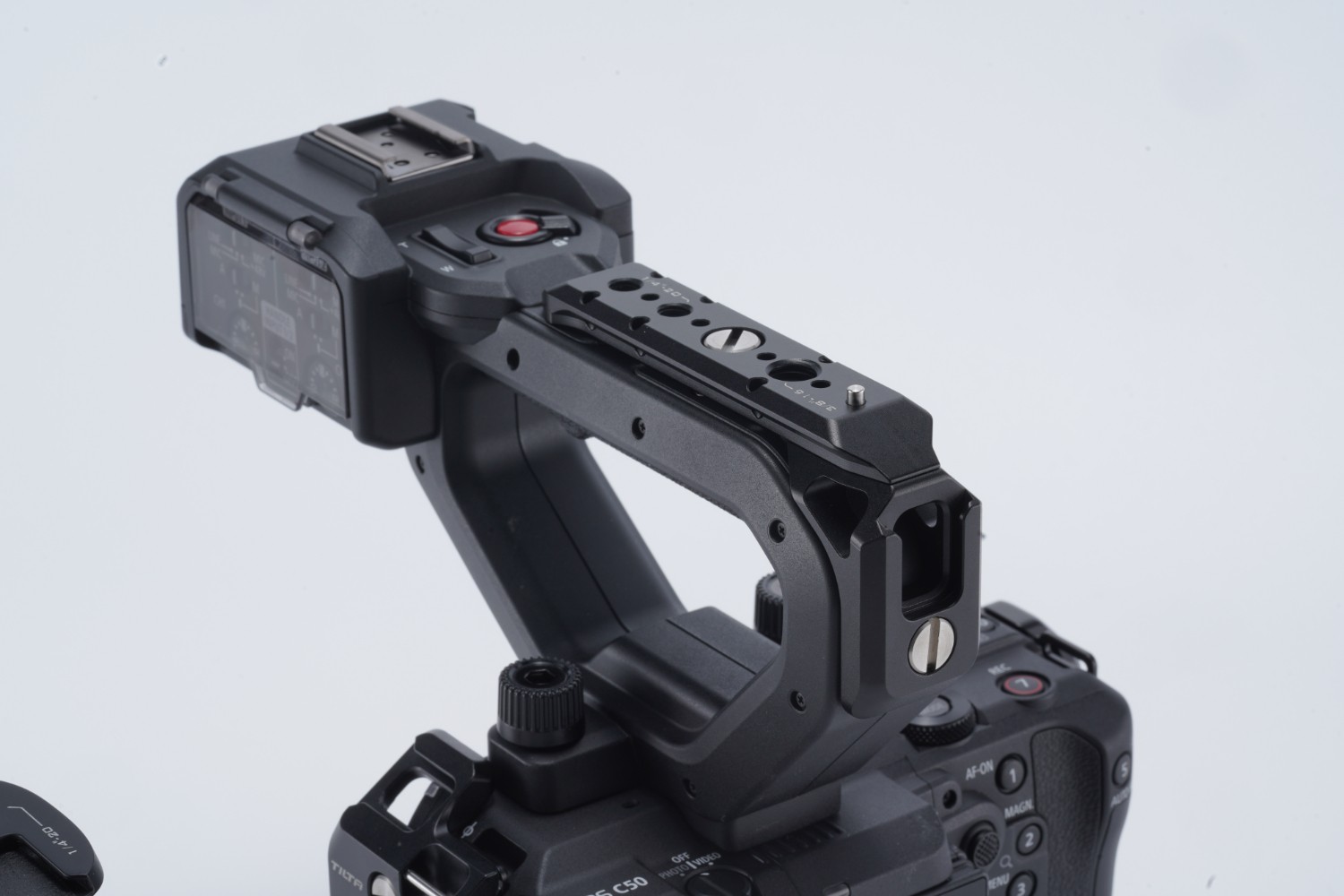 Dieses mechanische Zubehörteil wird am originalen XLR-Obergriff für die Canon C50 befestigt. Es bietet zusätzliche Befestigungspunkte für Zubehör wie eine integrierte NATO-Schiene und einen Blitzschuh-Empfänger.