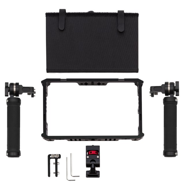 Formschlüssiger Aluminiumkäfig für TVLogic F-7H/M2/F-7HS 7" Feldmonitore. Im Lieferumfang enthalten sind zwei leichte, perfekte Griffe mit Rosetten im ARRI-Stil. Die Griffe sind aus weichem Gummi gefertigt und liegen während Ihrer Filmproduktion oder Ihres Videodrehs sehr gut in der Hand. Dank der perfekten Griffe und der Montagehalterung können Sie Ihren TVLogic F7H-Monitor montiert, in der Hand gehalten oder bei Verwendung eines kabellosen Empfängers sogar eigenständig verwenden! Die mitgelieferte, leicht zu befestigende Sonnenblende schützt Ihren Monitor vor Blendung und ermöglicht gleichzeitig den Zugriff auf die Bedientasten des Monitors.
