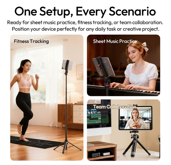 Für zusätzliche Vielseitigkeit verfügt die Klemme über eine integrierte Kaltschuhhalterung, an der Benutzer Zubehör wie Mikrofone, Leuchten oder andere Geräte befestigen können – ideal für die Erstellung von Inhalten, Streaming oder Präsentationen.