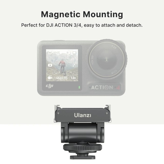 Der Ulanzi Cold Shoe Mount Adapter für DJI Osmo Action 3/4 & Pocket 3 verfügt über einen Magnetfuß, eine robuste Aluminiumkonstruktion und eine Neigungsverstellung von 160°, wodurch eine flexible und sichere Befestigung an Cold Shoes, Käfigen und Kamerarigs möglich ist.