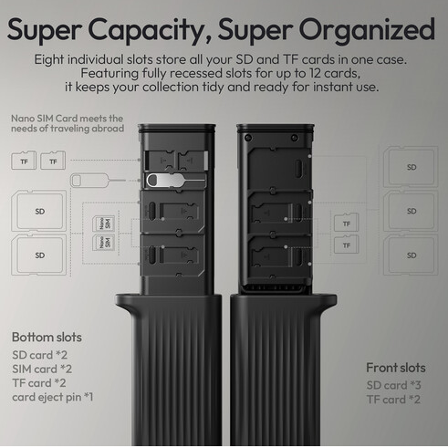Das Design des Etuis trennt die vorderen und unteren Fächer für eine effiziente Organisation: Im vorderen Bereich finden 3 SD-Karten und 2 TF-Karten Platz, während die unteren Fächer 2 SD-Karten, 2 SIM-Karten, 2 TF-Karten und einen Kartenauswurfstift aufnehmen. Seine robuste Bauweise schützt die Karten vor Staub, Kratzern und versehentlichen Beschädigungen und macht es perfekt für Fotografen, Videografen und Reisende, die unterwegs eine kompakte, zuverlässige Lösung zur Aufbewahrung ihrer Karten benötigen.