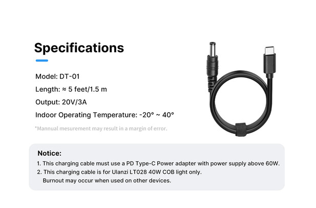 Das Ulanzi L082GBB1 DC-zu-USB-C-Stromkabel (1,5 m) dient zur Stromversorgung des Ulanzi LT028 Bi-Color LED Monolight über eine USB-C-Powerbank oder einen Adapter. Mit einer Ausgangsleistung von 20 V und 3 A gewährleistet dieses robuste 1,5 m lange Kabel eine effiziente Stromversorgung für Ihre Beleuchtungsanlage.