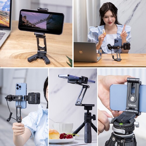 Das HP004 besteht aus einer strapazierfähigen Aluminiumlegierung mit gepolsterten Griffen und schützt Ihr Smartphone sicher vor Stößen. Seine verstellbaren Gelenke – 310° unten und 270° oben – ermöglichen eine präzise Positionierung, und dank der 360°-Drehbarkeit des Smartphones können Sie Ihre Inhalte aus jedem Winkel aufnehmen. Für erweiterte Funktionalität verfügt die Halterung über einen Arca-Schlitz, ein 1/4"-20-Befestigungsgewinde und zwei Kaltschuhe für Mikrofone, LED-Leuchten oder anderes Zubehör. Die kompakte, leichte und äußerst anpassungsfähige HP004 ist perfekt für Kreative, die eine tragbare, multifunktionale Smartphone-Halterung benötigen.