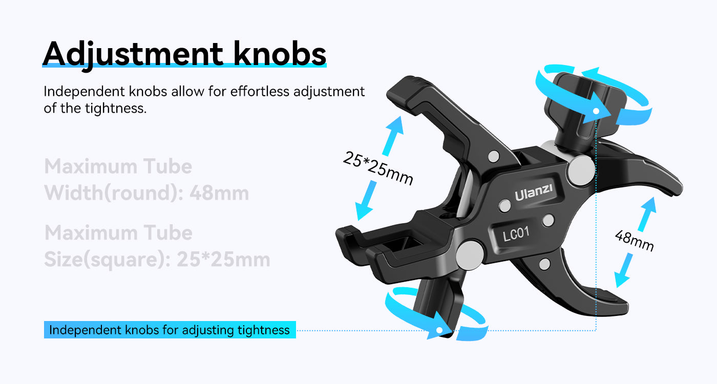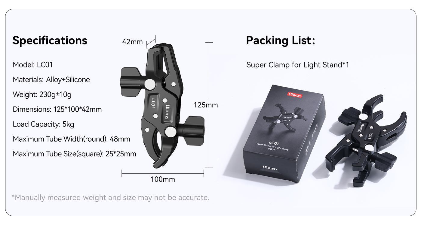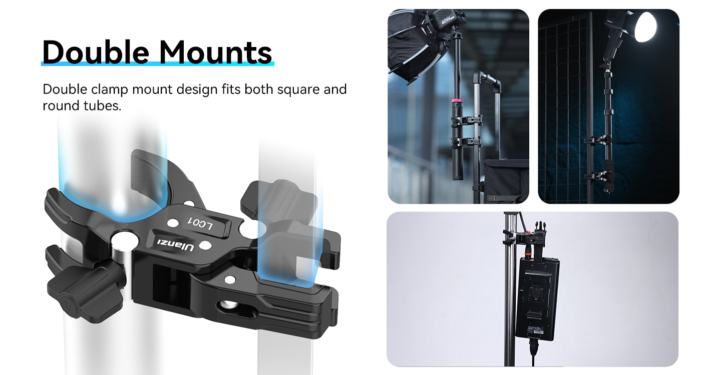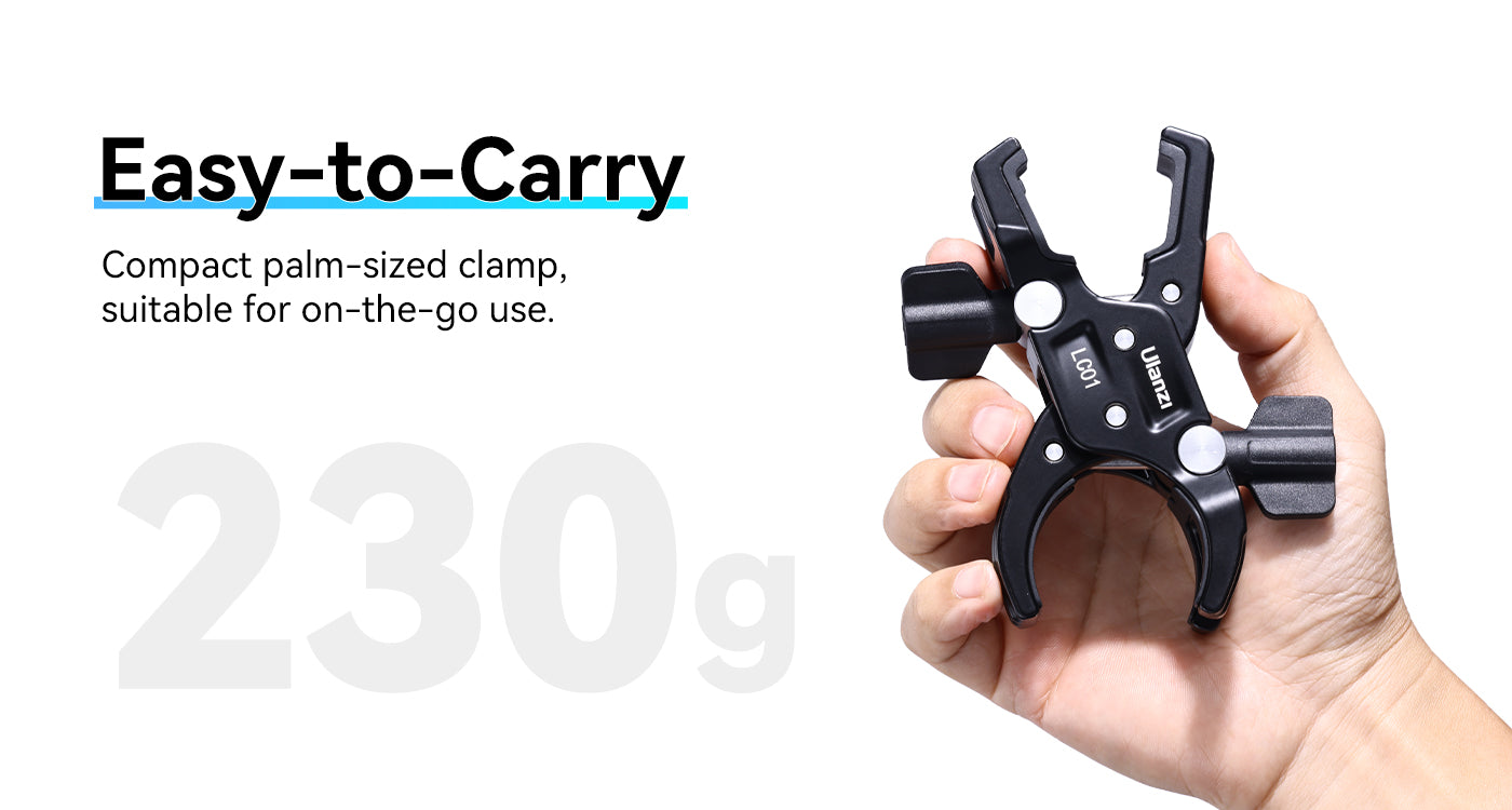 Die Ulanzi LC01 Super Clamp Mount ist eine kompakte, robuste Lösung zum Befestigen von Ausrüstung an Lichtstativen, Stativen oder Rigging-Aufbauten. Mit zwei Klemmen, die sowohl für runde als auch für quadratische Rohre geeignet sind, trägt sie bis zu 5 kg Ausrüstung – perfekt für Leuchten, Kameras oder Zubehör. Sie besteht aus einer robusten Legierung und griffigem Silikon und sorgt für felsenfeste Stabilität. Die LC01 ist ideal für mobile Kreative und Studio-Profis gleichermaßen und bietet präzise Kontrolle und Tragbarkeit in einem handflächengroßen Kraftpaket.